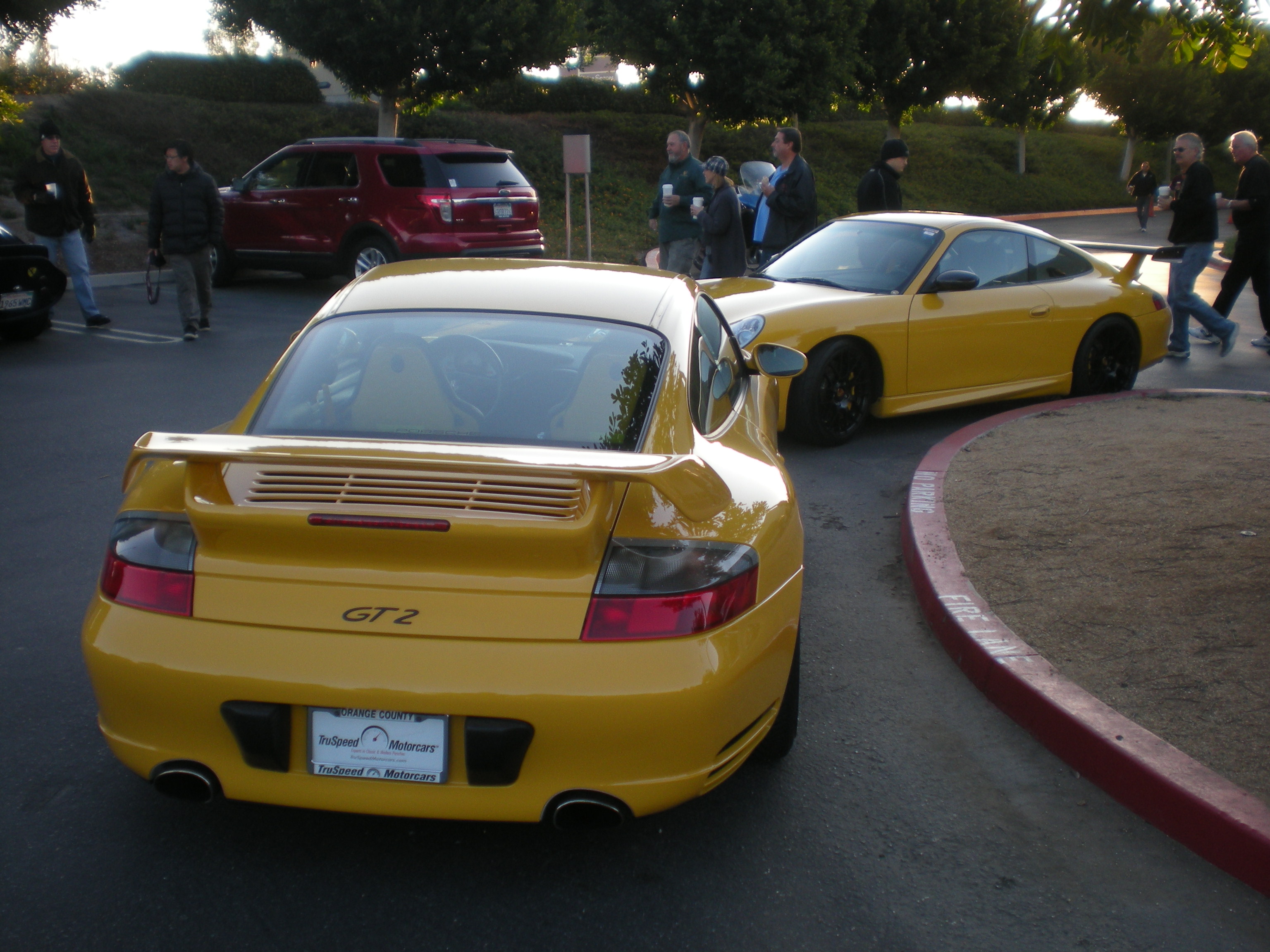 Saturday morning as I pulled into the parking lot at Cars and Coffee / Irvine, and made my way towards the row where I usually park, I was greeted by the lunar eclipse bathed, silhouettes of two Truspeed Porsche GT3 cup cars parked diagonally in formation, anchoring an all Porsche row. Mixed in amongst the row were several Porsche 356’s , a couple early 1960’s short wheelbase 911’s, a Porsche 924, 914-6, and a handful of 911’s from the 1970’s, ’80’s and 90’s. And aligned like bookends, opposite the cup cars were two matching speed yellow Porsche 996’s: one a tricked-out 996 GT3 and the other, a 2003 GT2.