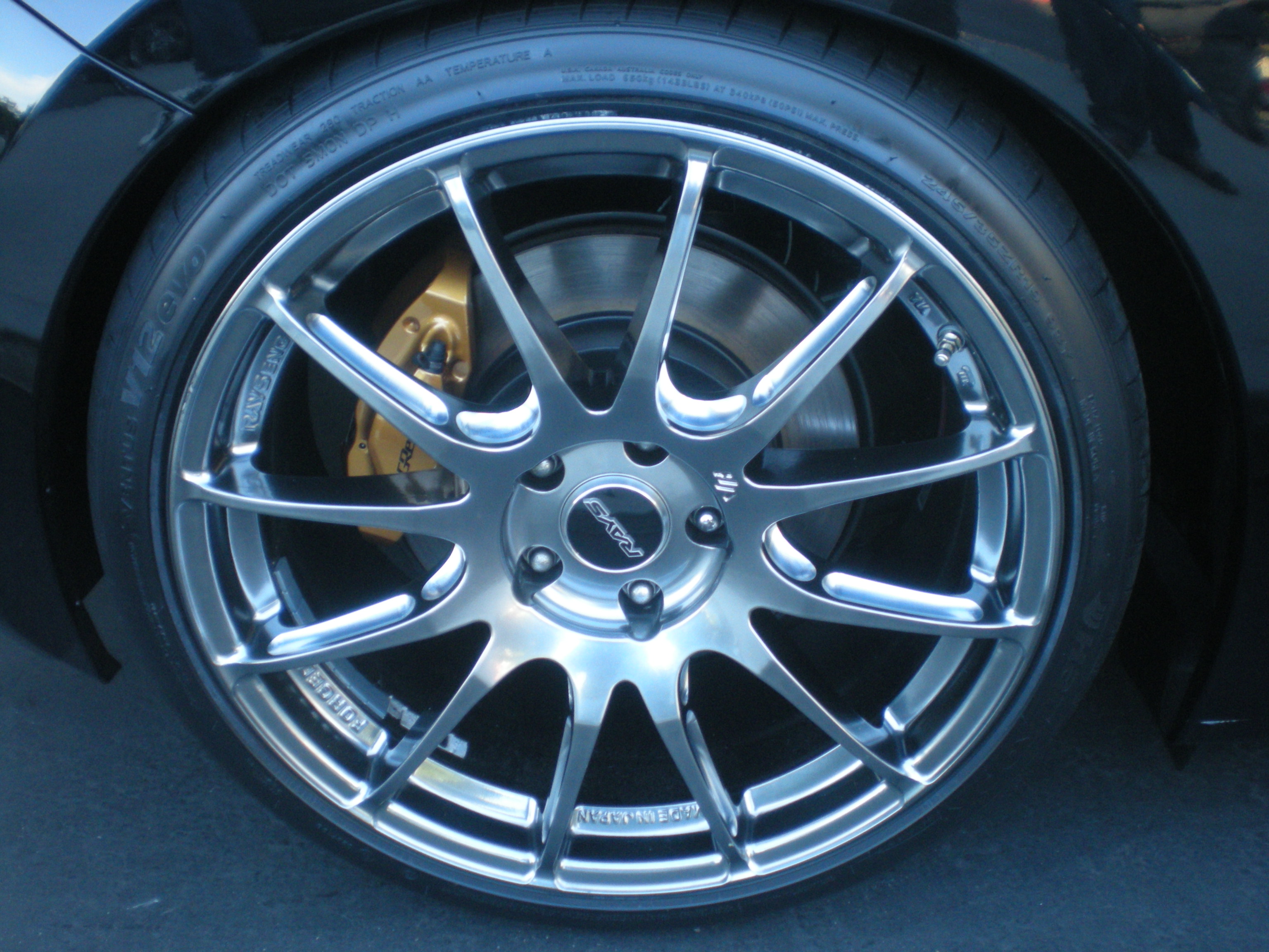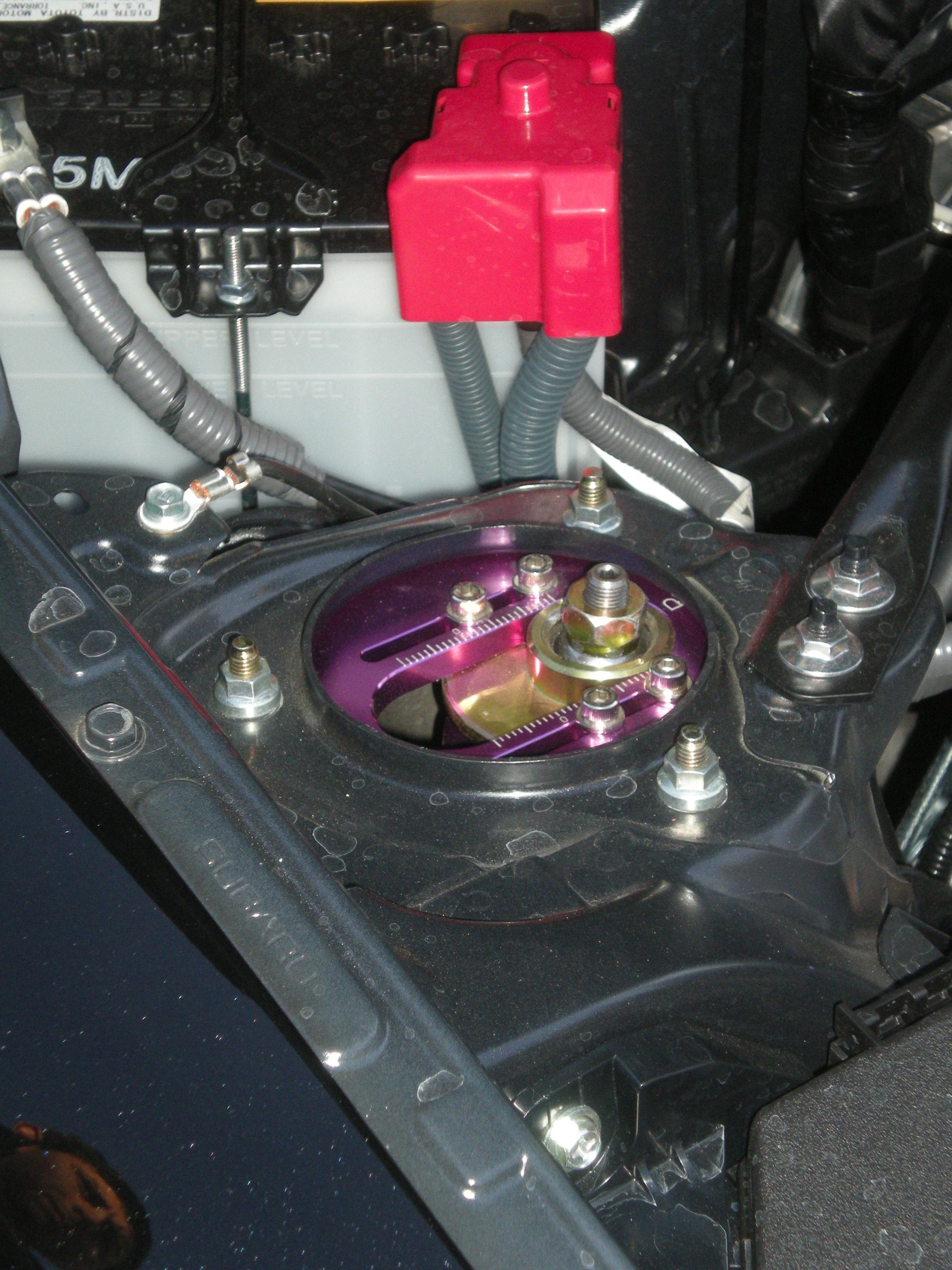 After I finished shooting the Porsches, I noticed a crowd gathered around a low black coupe parked in the end space of the smaller perpendicular parking lot. As I made my way through the crowd, I saw a badge on the nose of the car that read Scion. As I got closer, I recognized the car as the new collaboration between Toyota and Subaru, with the Scion being Toyota’s version. It also wore some subtle Greddy graphics displayed about the car. The badge on the back identified this car as an FR-S model, although the Subaru model will wear BRZ badging. Out back, the blue tipped, dual titanium exhaust dominated the view, framing the rear diffuser panel. After a few minutes, the hood was opened up to reveal a Subaru boxer motor, and a few go fast parts, such as the purple anodized, front shock strut adjustment plates. The car appeared to have been lowered, and was riding on a set of silver Rays wheels, wrapped in 245/35ZR-19 rubber. Given the crowd around this car and the buzz it was generating, it sure looks like Toyota has a hit on its hands…