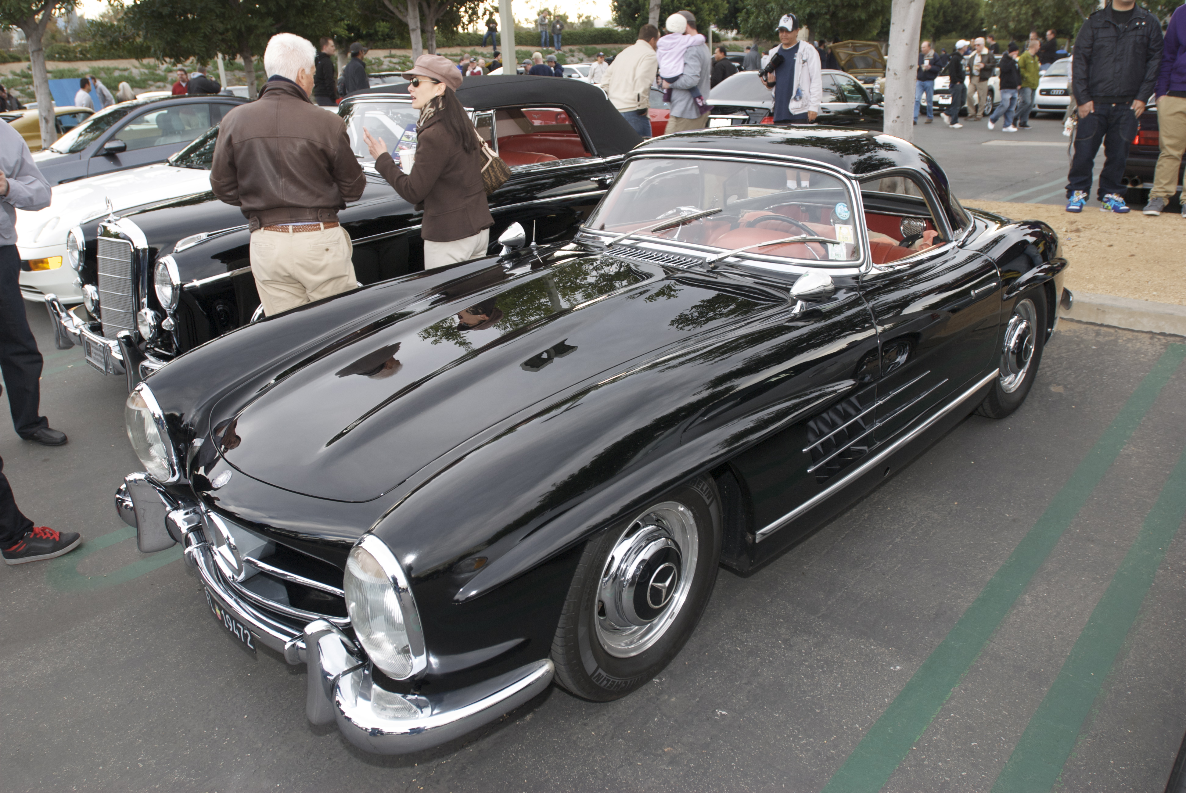 Parked several rows beyond the McLaren, was another black beauty; in this case a beautiful black on red, Mercedes-Benz 300 SL roadster, wearing its optional hardtop…