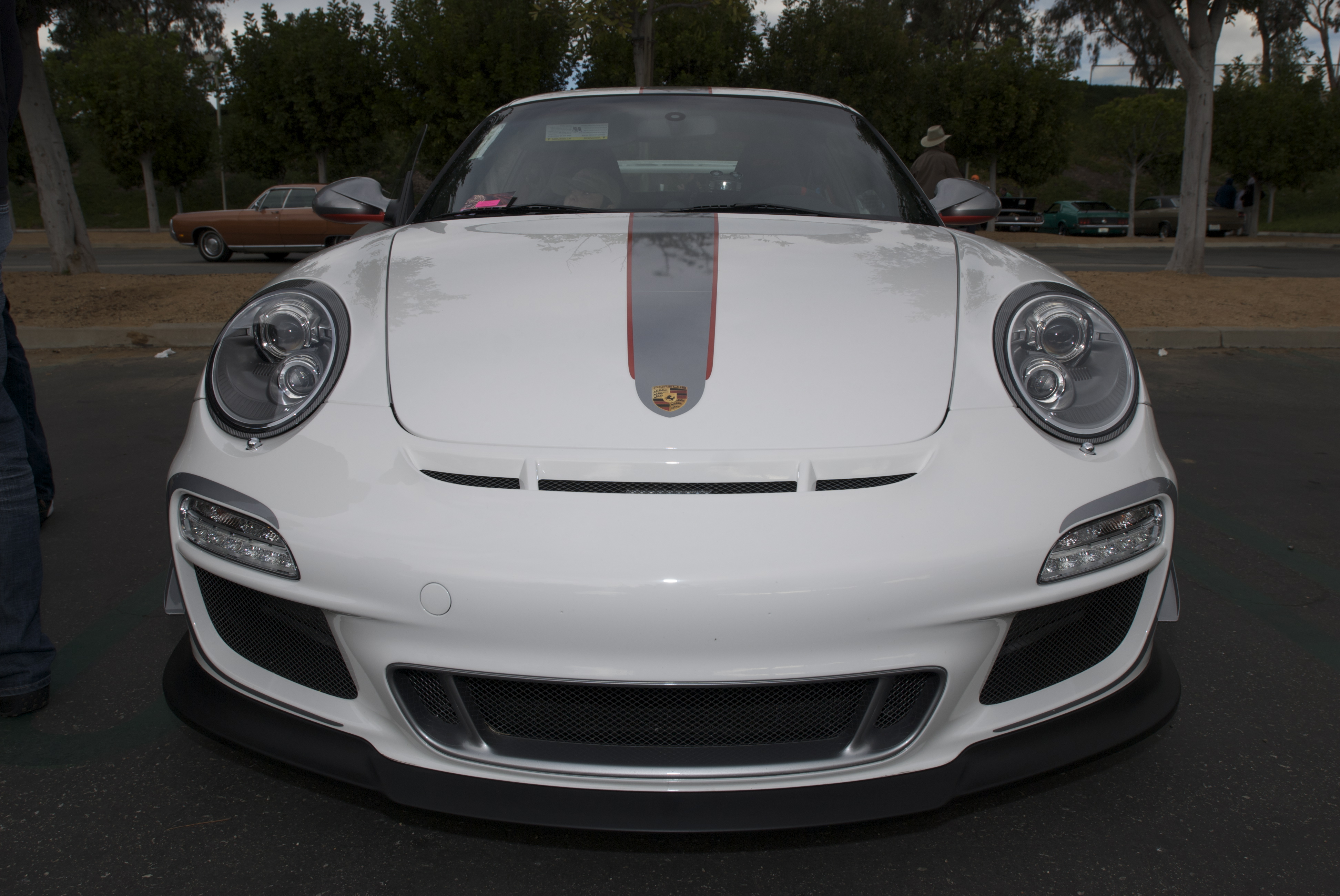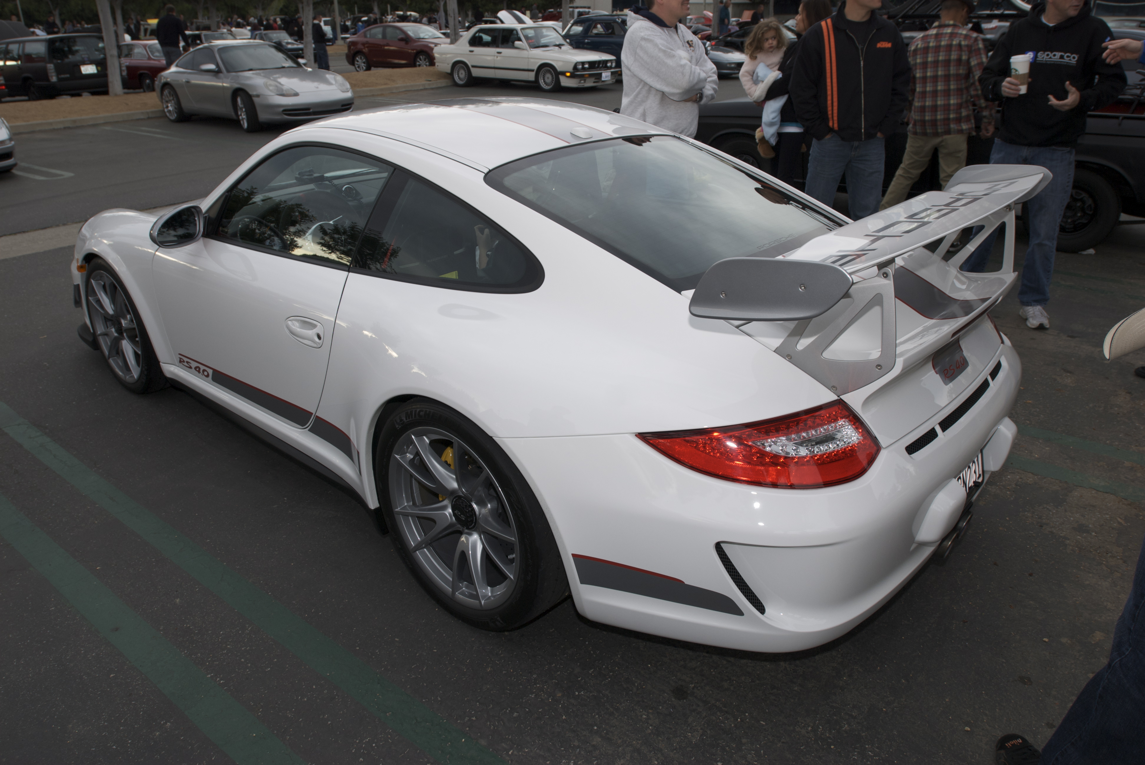 As I made my way through the several remaining rows yet unexplored, and just as I rounded the end of the previous row, I spotted a white Porsche 997 parked half way up on the left side, sandwiched between two cars. As I approached, the car to the left pulled out, revealing GT3 RS4.0 graphics on the side of the white Porsche. Could this be the RS 4.0 that I had seen back in December? It had the optional silver wheels which I remembered seeing, but the proof would be its license plate. Sure enough, the California license plate on the back confirmed to me that I had finally caught up with my elusive GT3 RS4.0.
