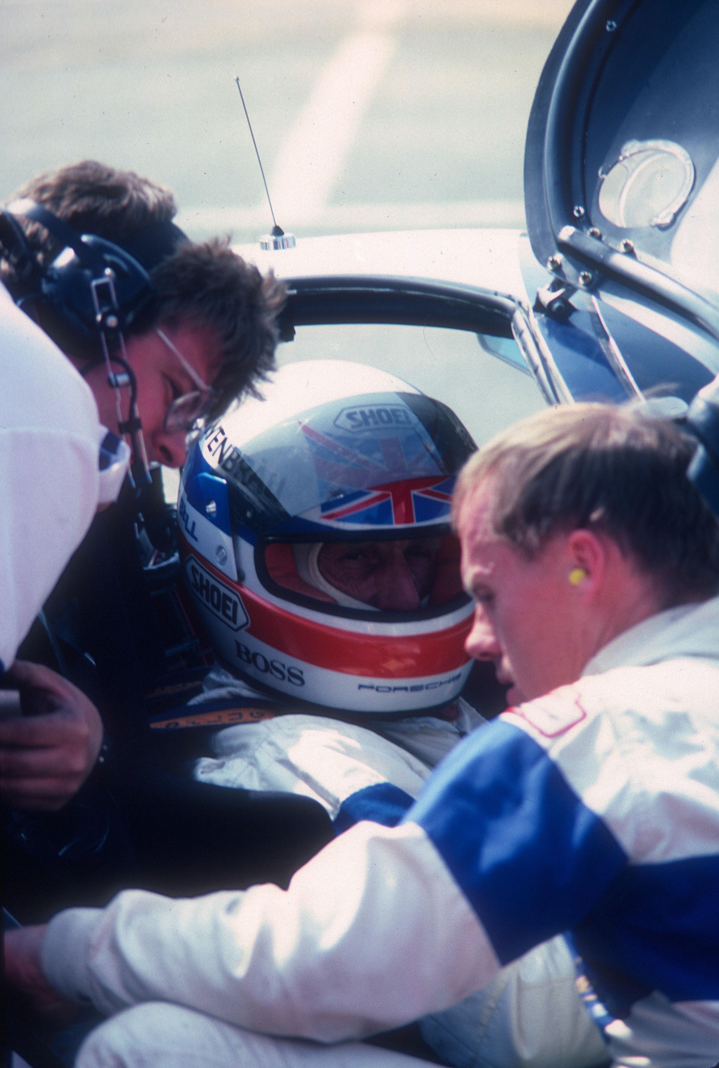 Derek Bell_#14 Lowenbrau Porsche 962_Riverside Raceway_Apr 86Derek Bell, crew chief Kevin Doran, and the late Al Holbert_#14 Lowenbrau Porsche 962_Riverside Raceway_Apr 86