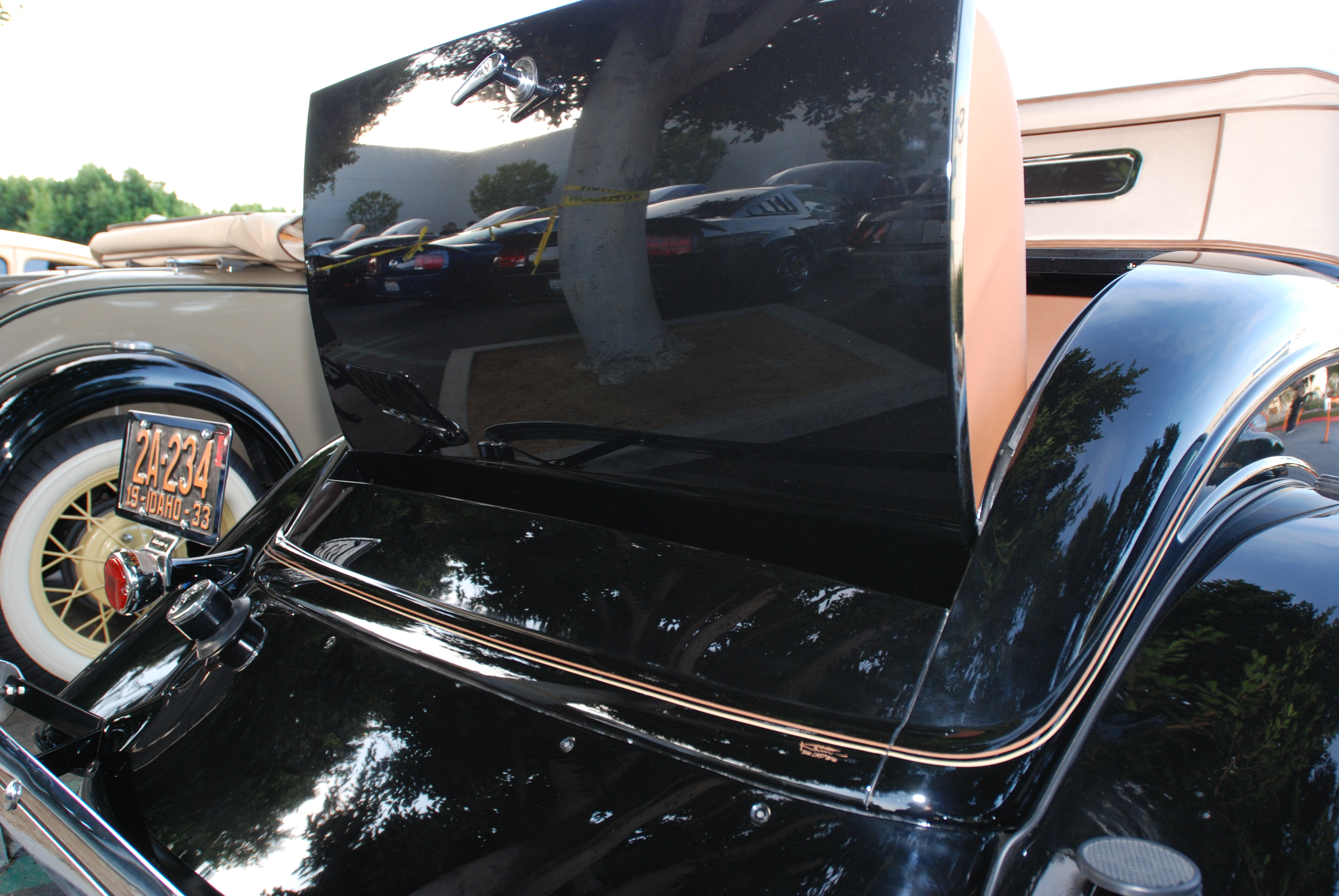 Black 1933 Ford roadster_rear view/rumble seat reflections_Cars&Coffee/Irvine_2/181/12