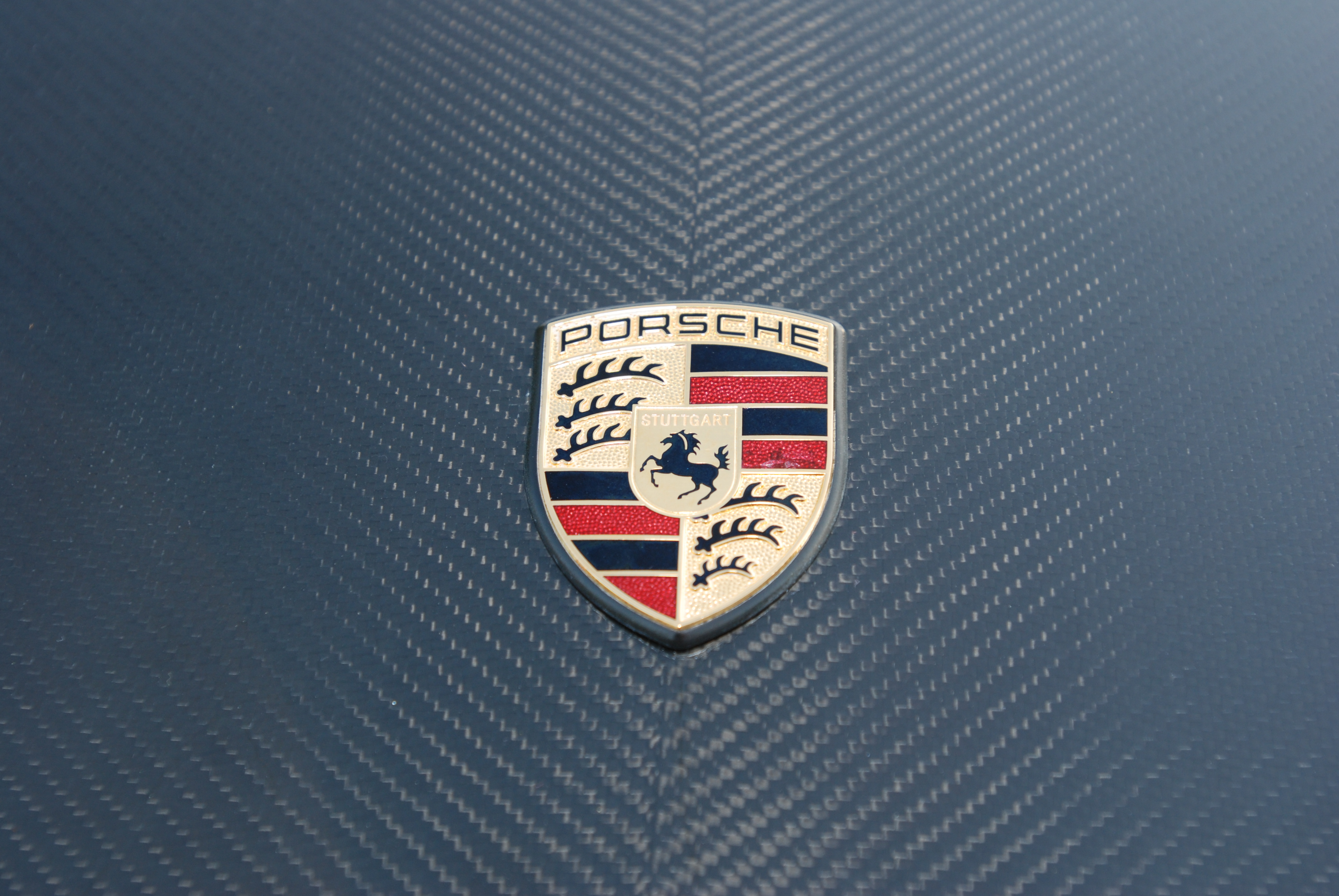 White Porsche 997 GT3 _Carbon fiber hood and Porsche emblem_Cars&Coffee/Irvine_2/18/12