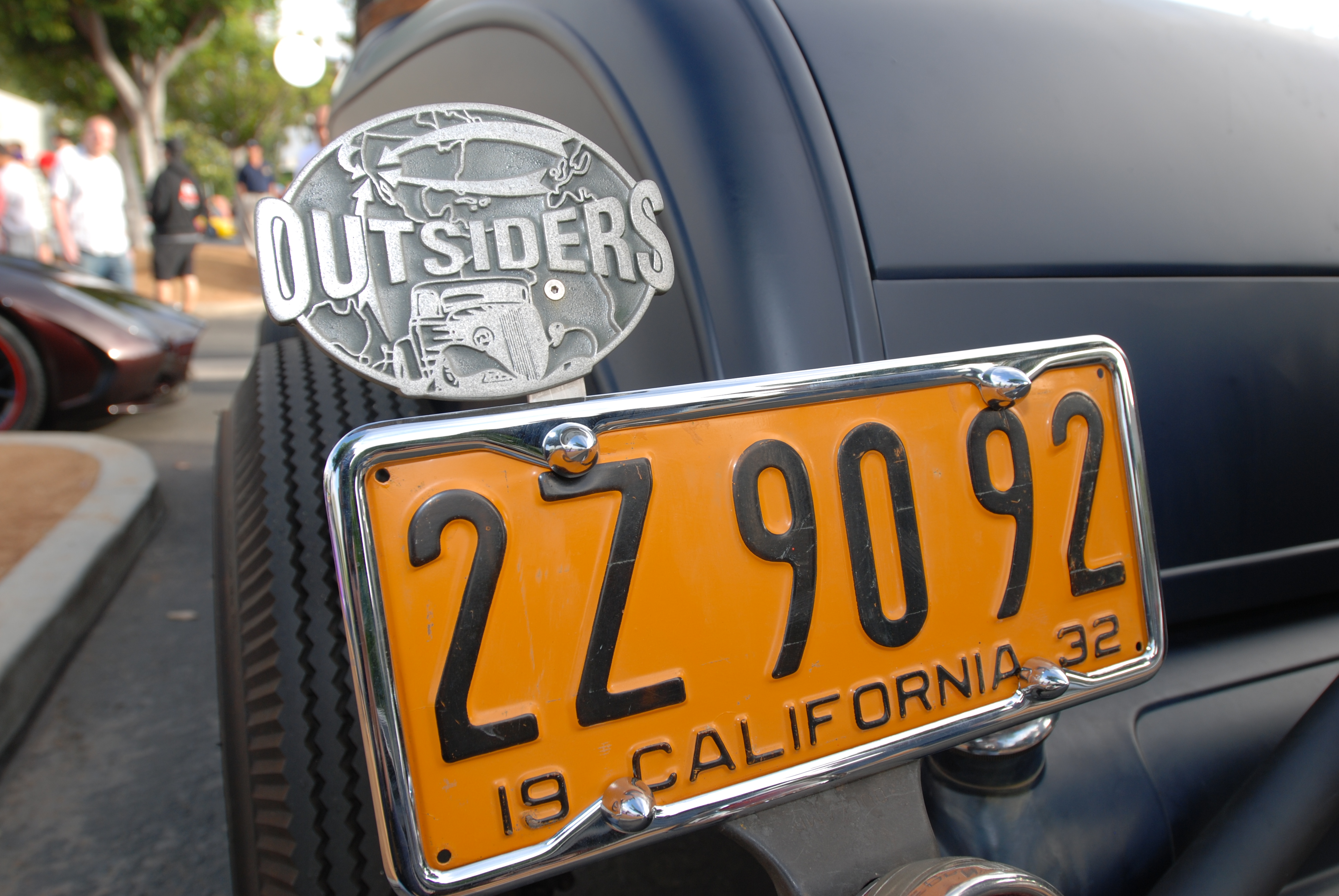 Primer gray 1932 Ford highboy_rear club badge & license plate_Cars&Coffee_5/28/12