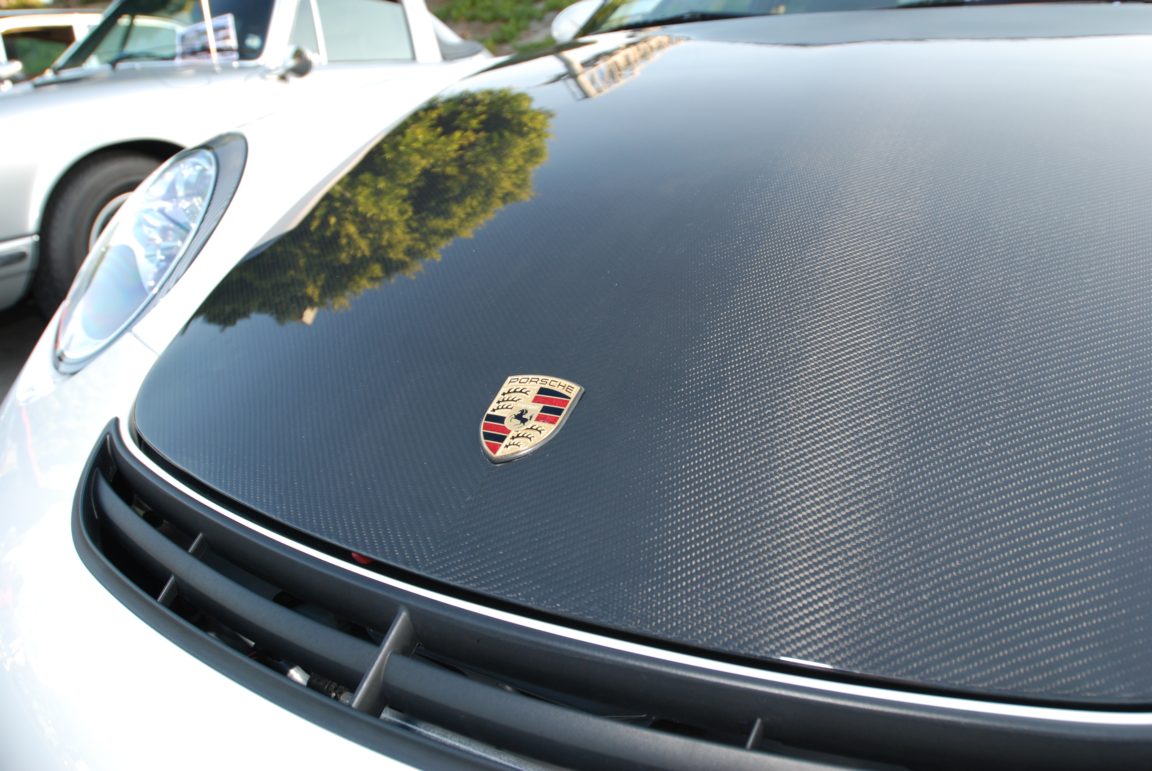 White Porsche GT3 _carbon fiber hood & badge detail_Cars&Coffee_5/28/12