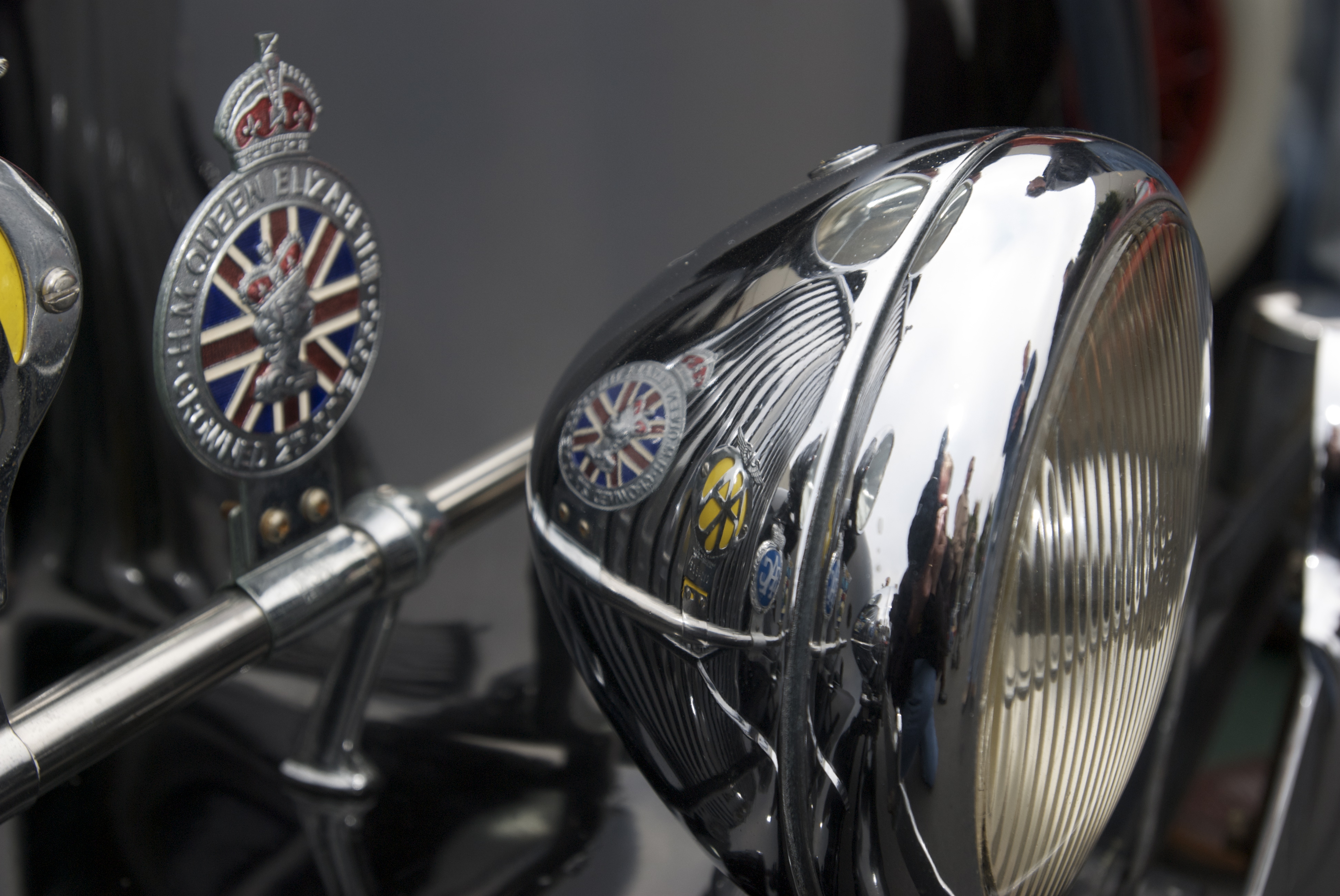 Vintage Jaguar touring sedan_driving light detail & club badge reflections_Cars&Coffee_5/28/12