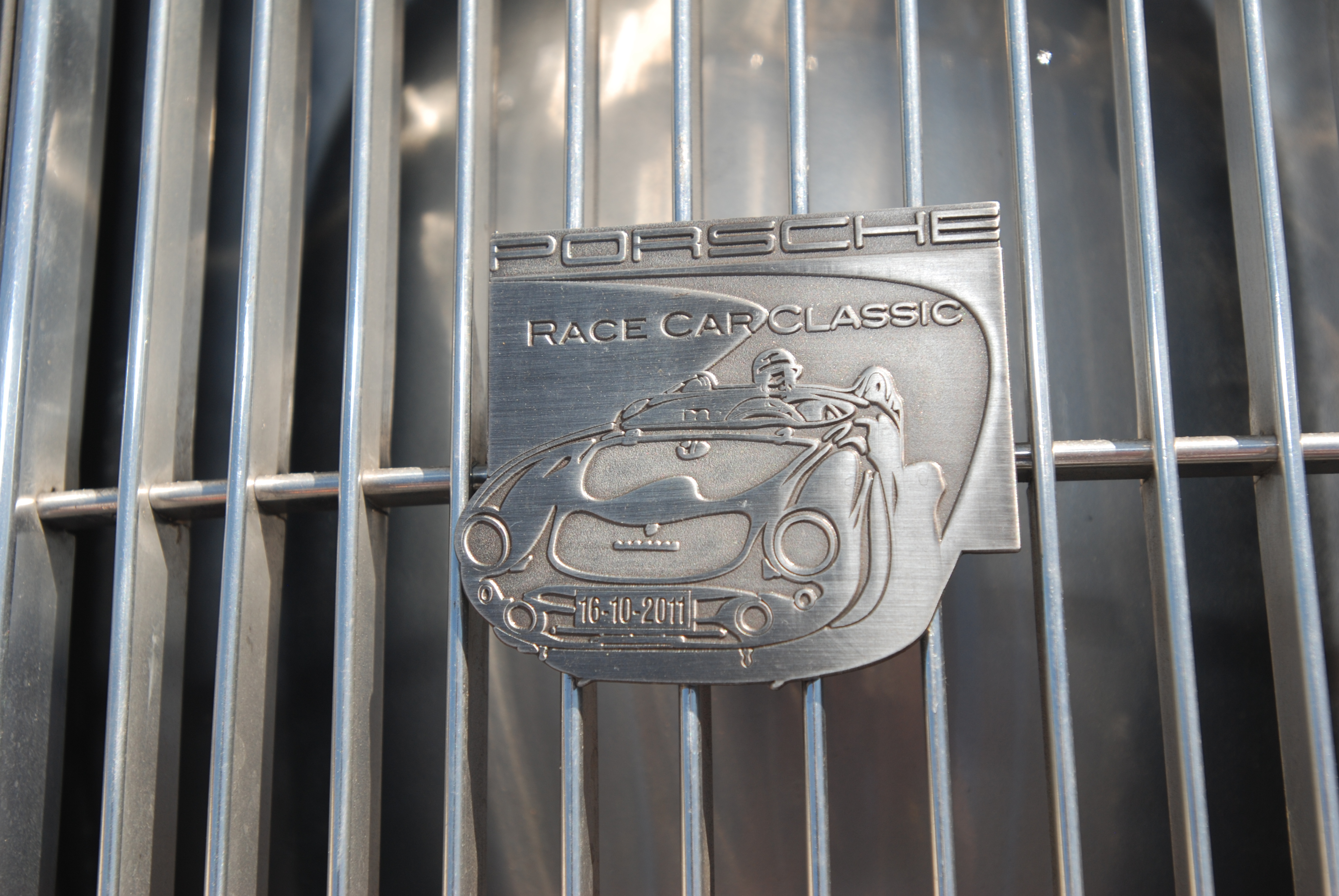 Silver Porsche 356 A coupe_rear grill event badge_Cars&Coffee_5/28/12