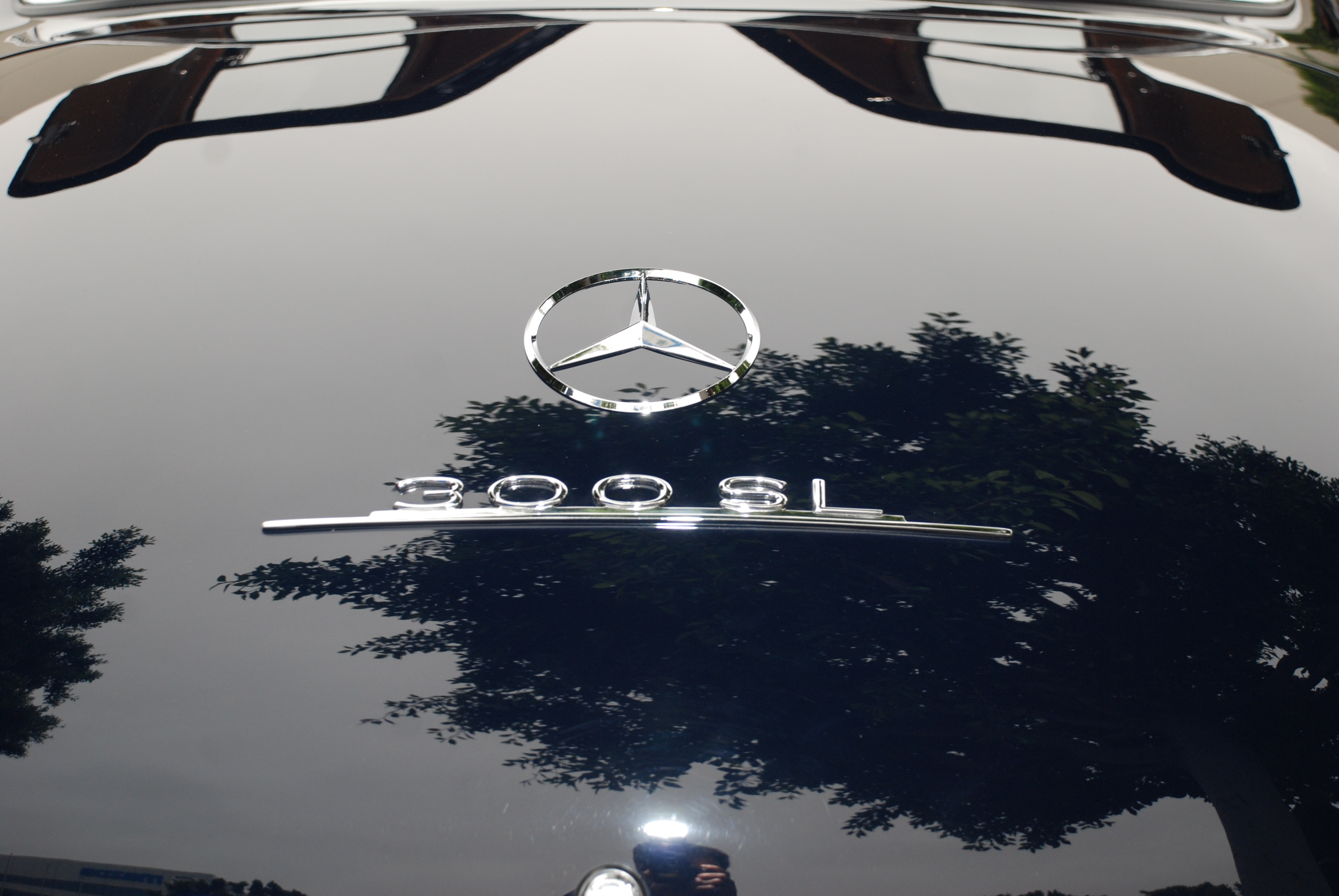 The paint job and overall finish on this car was equally mind-blowing; the color depending upon the lighting, appeared as either a very dark blue or a bluish black. I had a chance to ask the owner about this unique color and its spec name, and with a straight face he responded “its blue”… I followed that up by stating that it looked allot darker than any of the other Mercedes-Benz blues that I have seen. He then confessed that this particular shade of blue was in fact a custom color that he created, to insure that there would not be another 300 SL Gullwing coupe painted this same color. The dark blue finish also lent itself well as a medium for capturing some incredible reflections across its flawless contours.