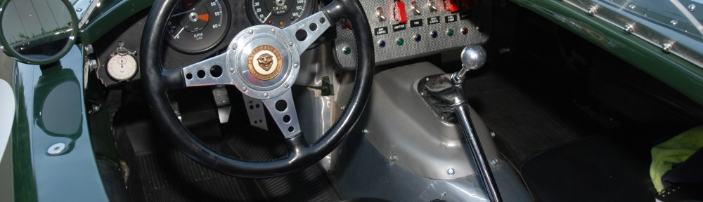 British Racing Green Jaguar E-type race car_1 of only 16_badging&reflections_Cars&Coffee / Irvine_July 28, 2012British Racing Green Jaguar E-type race car_1 of only 16 built_cockpit detail_Cars&Coffee / Irvine_July 28, 2012