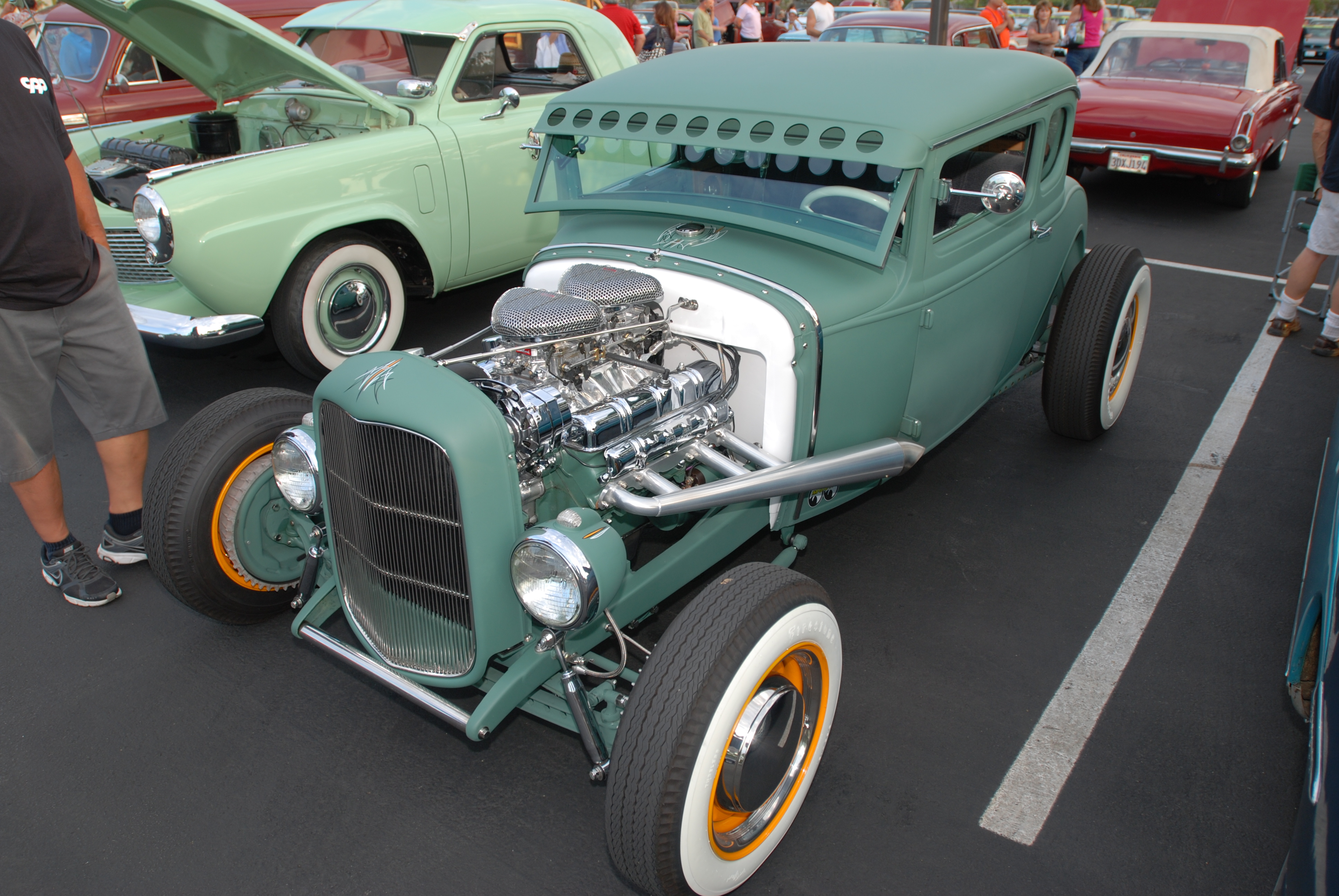 As evidenced by the reflection above, parked immediately to the right of the Z-28, was this bright red hot rod; a 1932 Ford highboy roadster complete with flames…