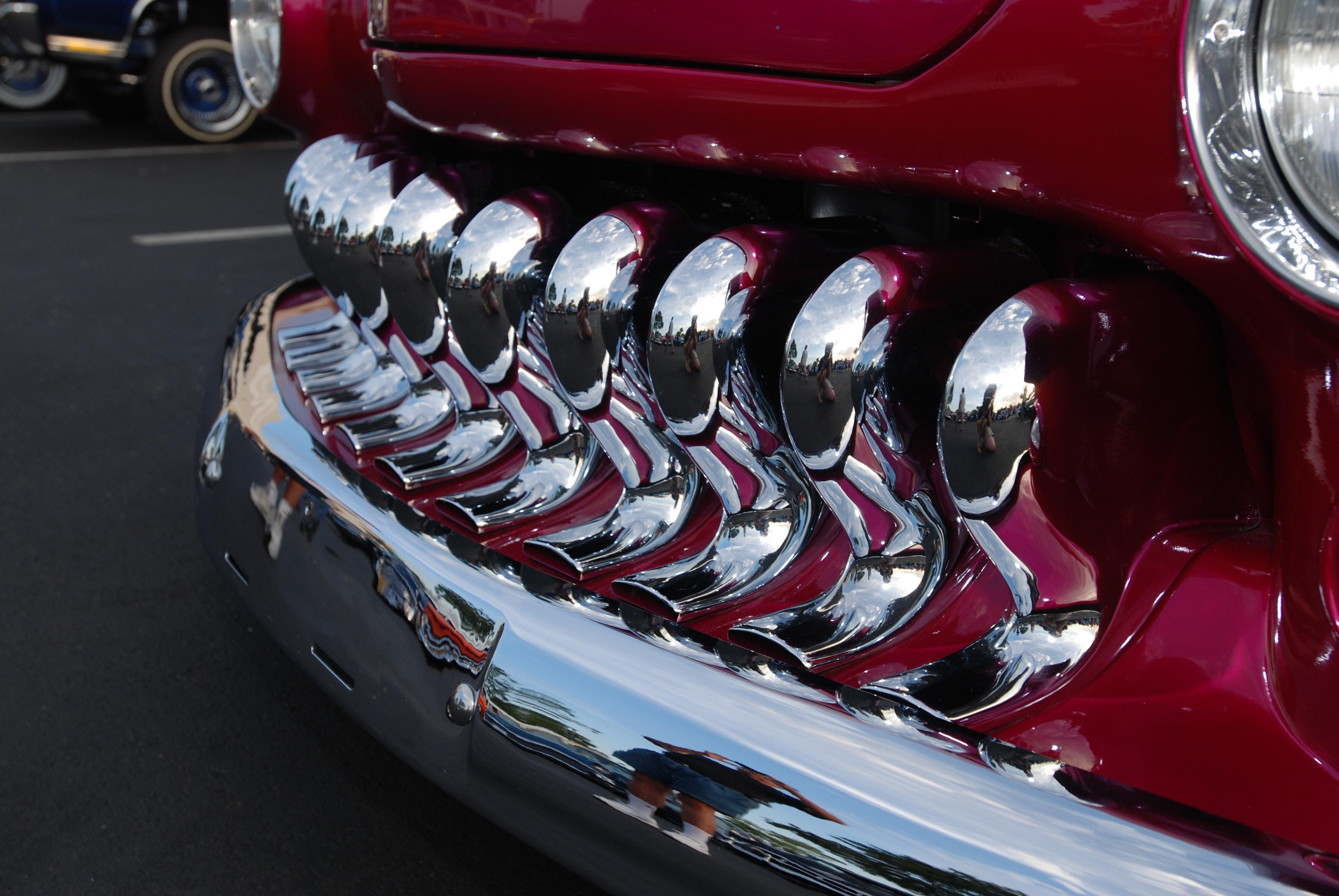 Aqua Blue with magenta flames, chop top Mercury coupe_front grill detail_Ruby's Diner car show_ Whittier,California_August 3, 2012