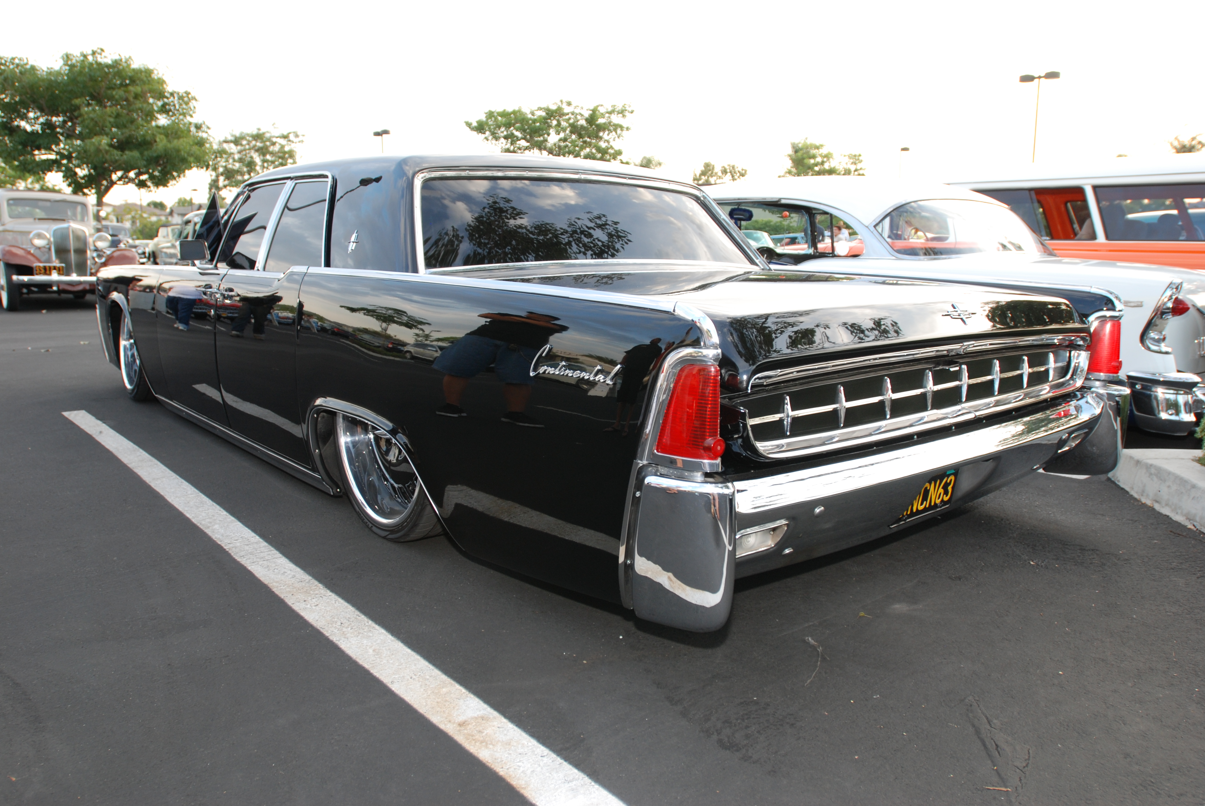 Black 1963 custom Lincoln Continental _3/4 rear  view w/ reflections_Ruby's Diner car show_ Whittier,California_August 3, 2012