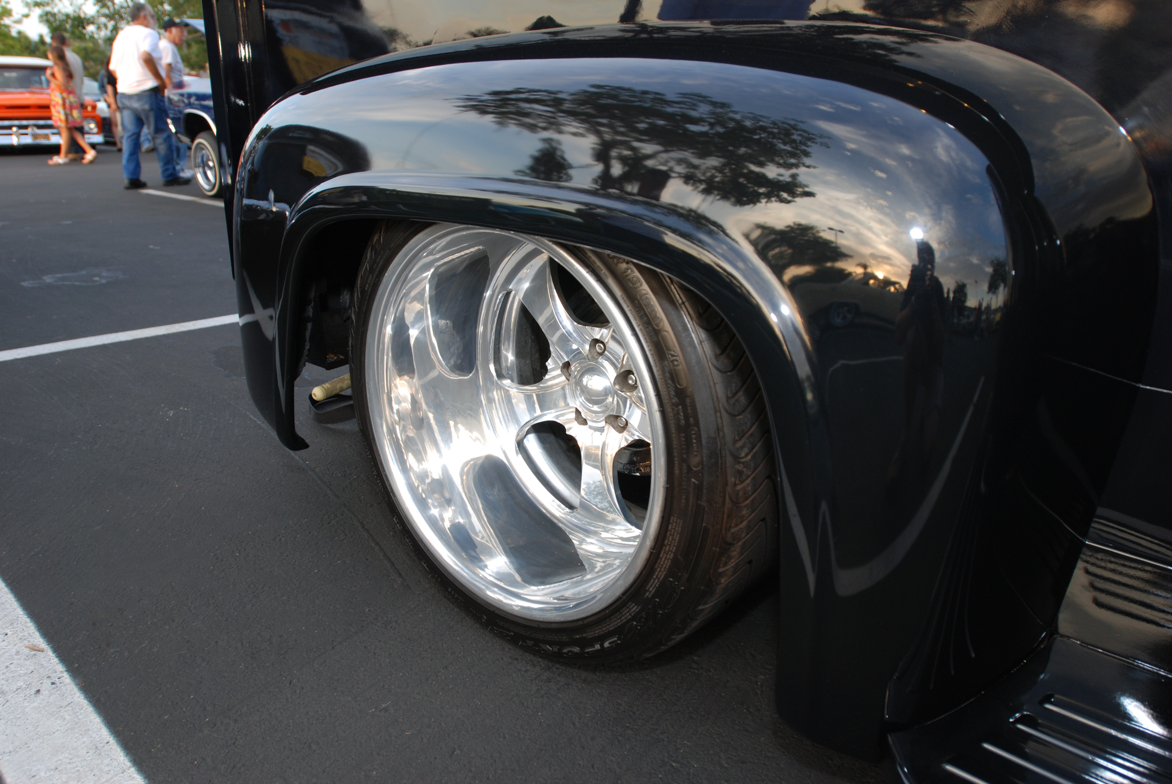 Black  1950's vintage Ford F-100 custom truck_rear fender reflections and wheel detail_Ruby's Diner car show_ Whittier,California_August 3, 2012And parked over in front of the diner, amongst the other hod rods on display, was this raspberry colored coupe with polished aluminum velocity stacks rising skyward through its front hood…