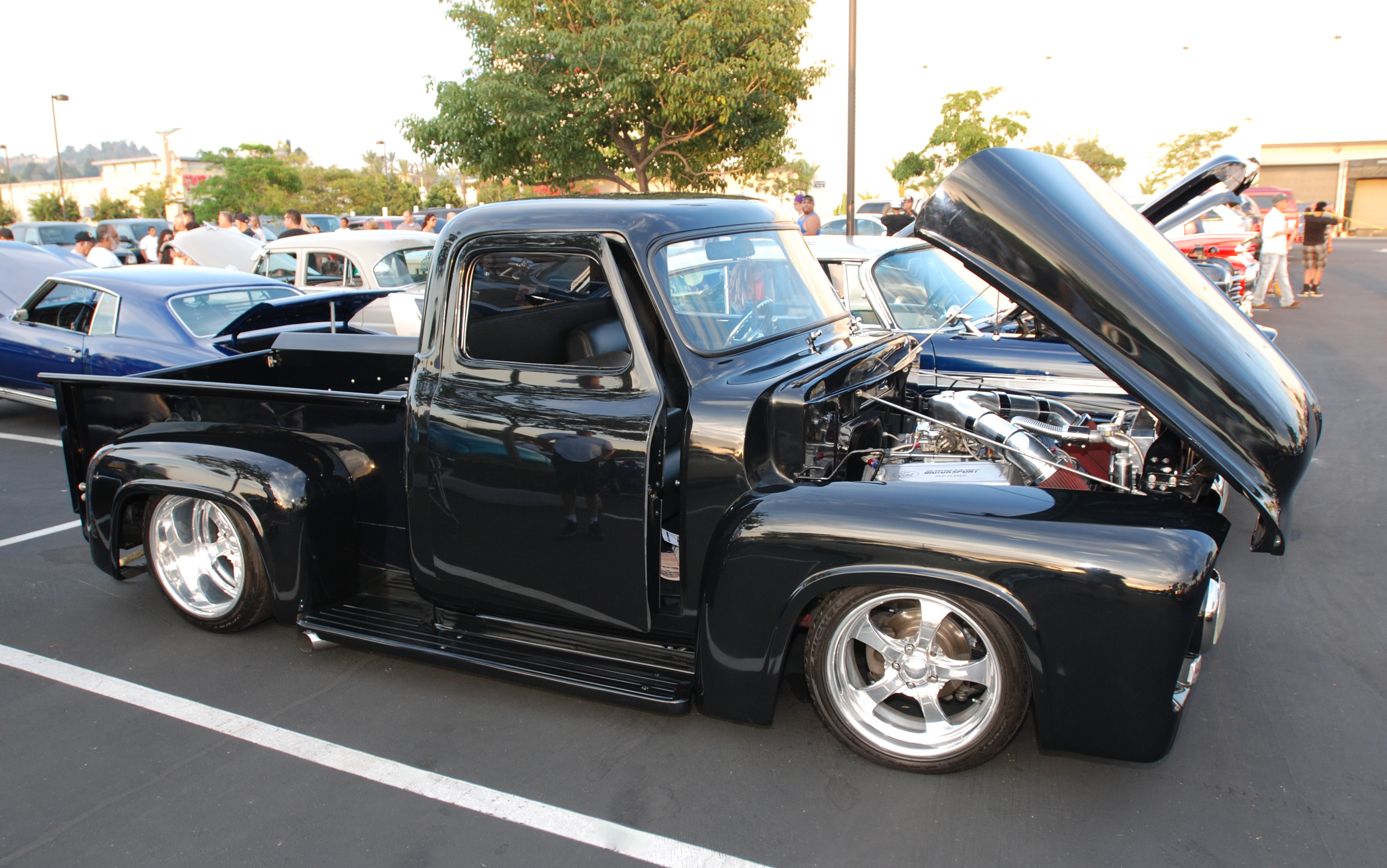 Black  1950's vintage Ford F-100 custom truck_3/4 side view and reflections_Ruby's Diner car show_ Whittier,California_August 3, 2012complete with a Ford Motorsport  / SVO V8 engine tucked in between the front fenders…