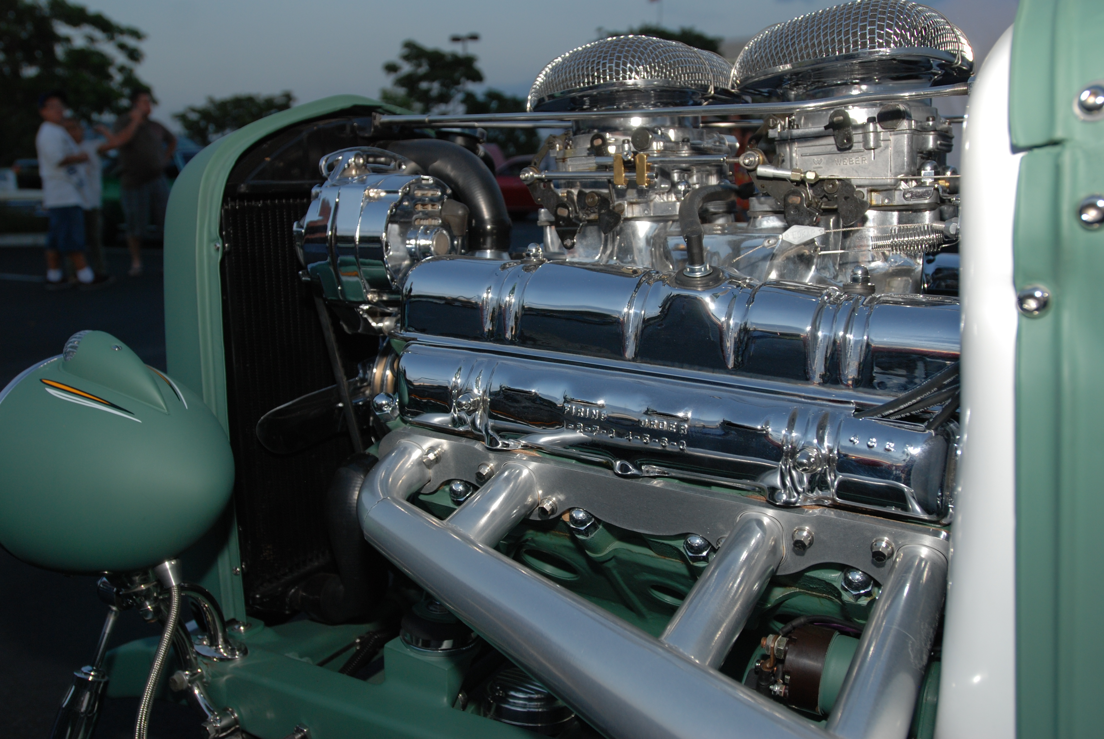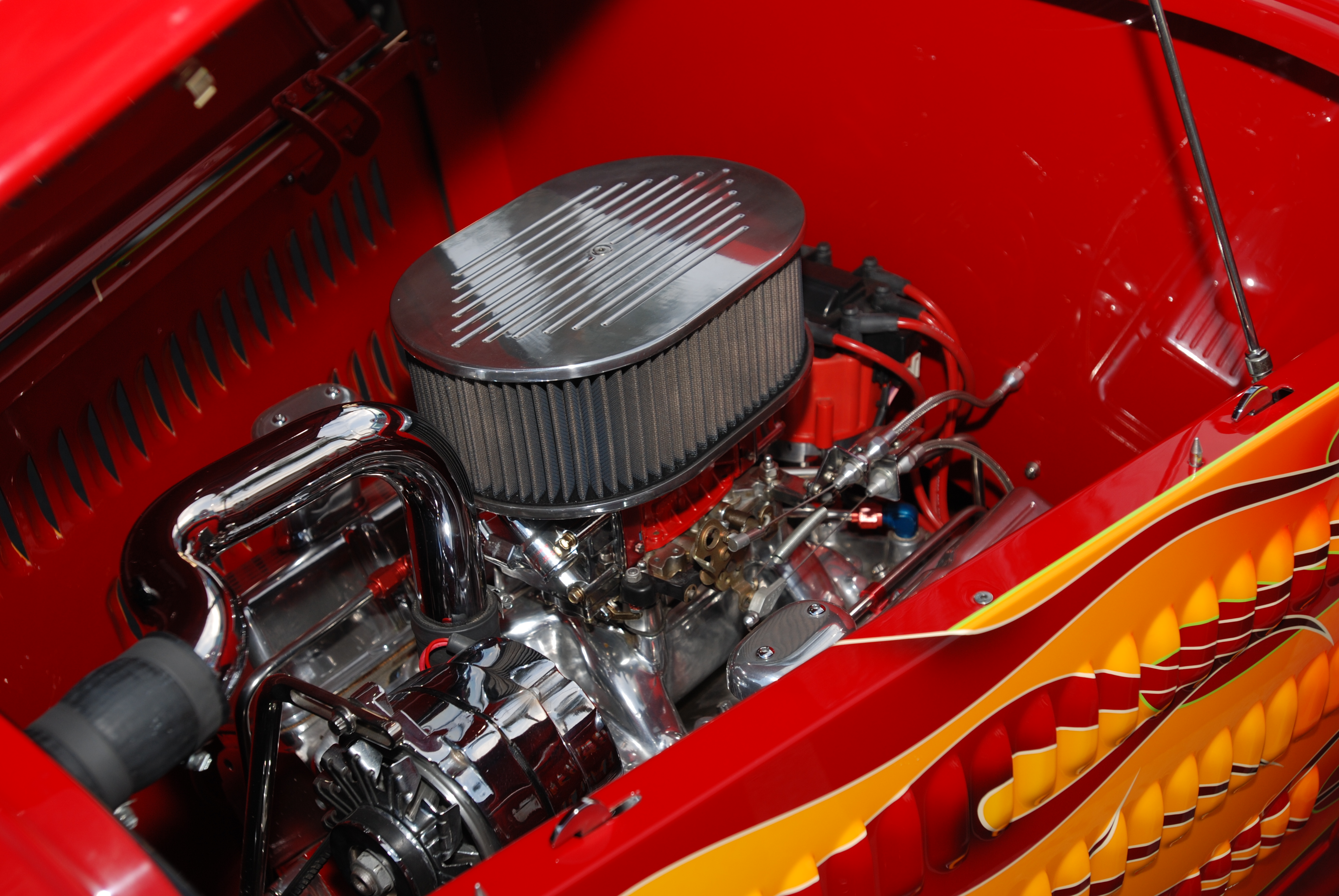 Red 1932 Ford highboy roadster with flames_engine compartment detail_Ruby's Diner car show_ Whittier,California_August 3, 2012
