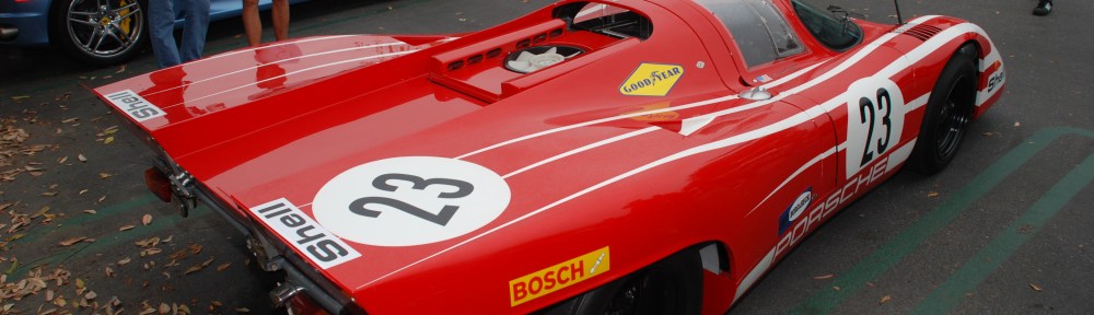 Gemini Blue 1973 Porsche 911E_3/4 front view Porsche row_Cars&Coffee/Irvine_August 25, 2012As I’ve noted in previous posts, I began attending Cars&Coffee back in 2008, and have observed over time an increase in the number of participants bringing their pets (primarily dogs) to the show each week, thus my “poodles with attitude reference”. Unfortunately, not every pet is well-trained or behaved; the worst example I’ve seen was a dog that decided to relieve himself on a freshly polished custom chrome wheel, attached to a stunning hot rod. Unfortunately, the dogs owner appeared oblivious to the carnage that his dog had just rendered to the wheel finish, and the two of them simply walked away. The other down side with some of the untrained pets are the land mines they leave behind for the unwary pedestrian, both on the parking lot surface and planted medians that divide the parking lot rows. (This condition reminds me of navigating the sidewalks of Paris, France during the summer months, when they are visited by the owners and their pets out for their daily walk).