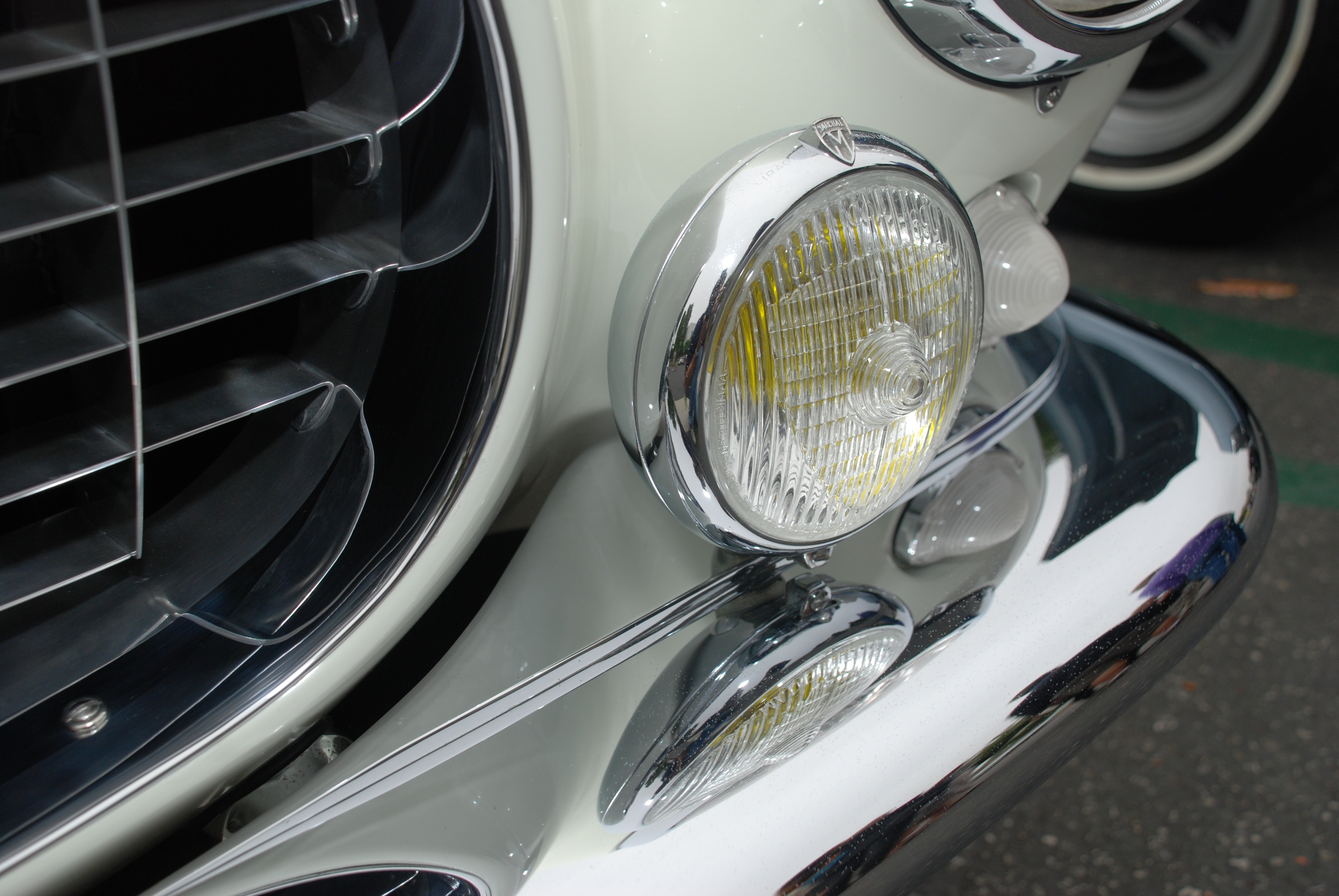 White and teal green 1955 Ferrari 250 Europa GT_front grill, bumper and driving light detail_Cars&Coffee/Irvine_August 25, 2012