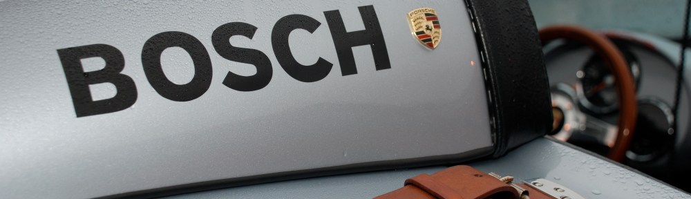 The cumulative effect of the mornings drizzle as seen on the hood and driving light; Rolly’s red, white and black 1966 Porsche 911.