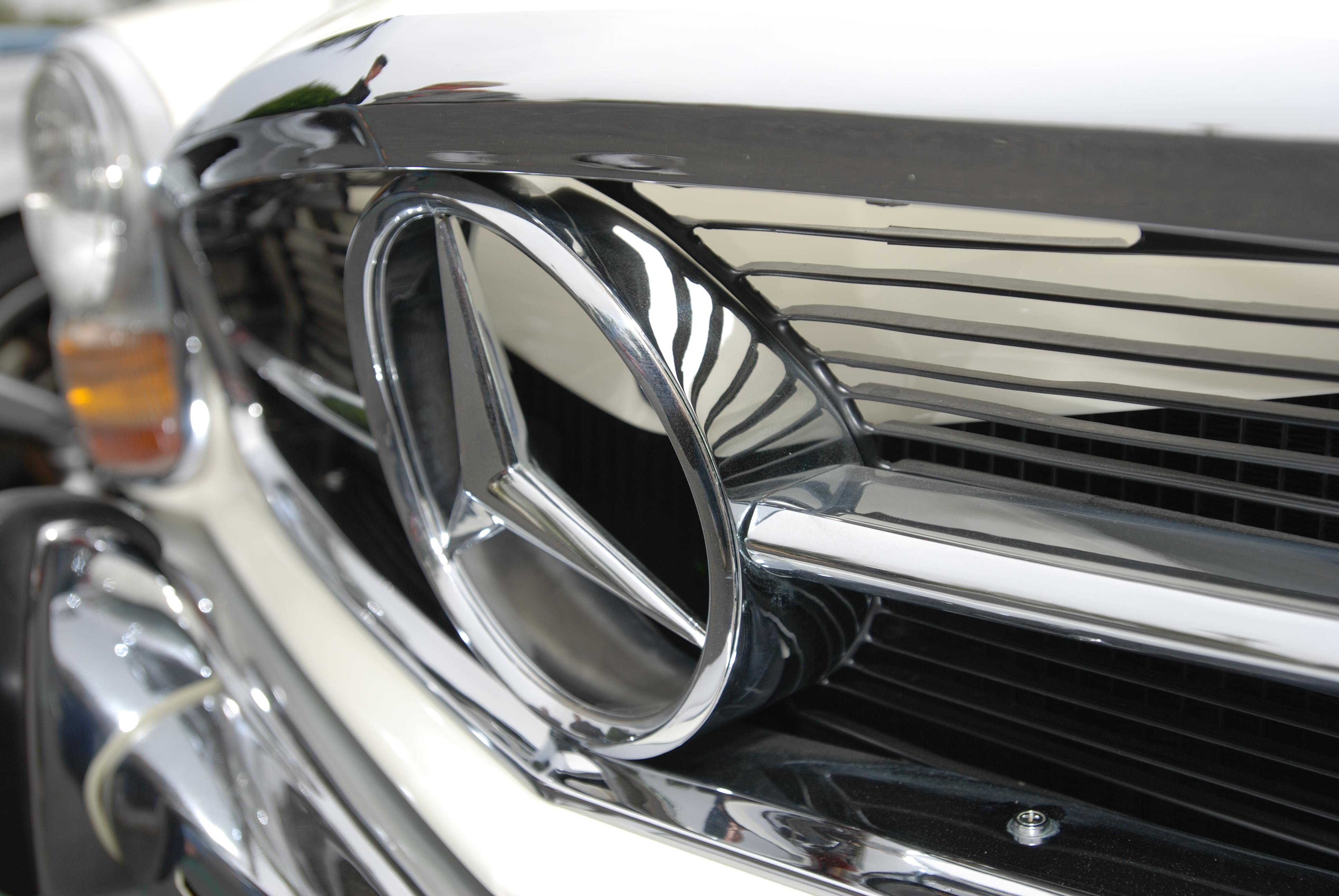 A pristine chrome grill and hood emblem, as observed on a beautifully restored,1969 Mercedes-Benz 280 SL coupe…