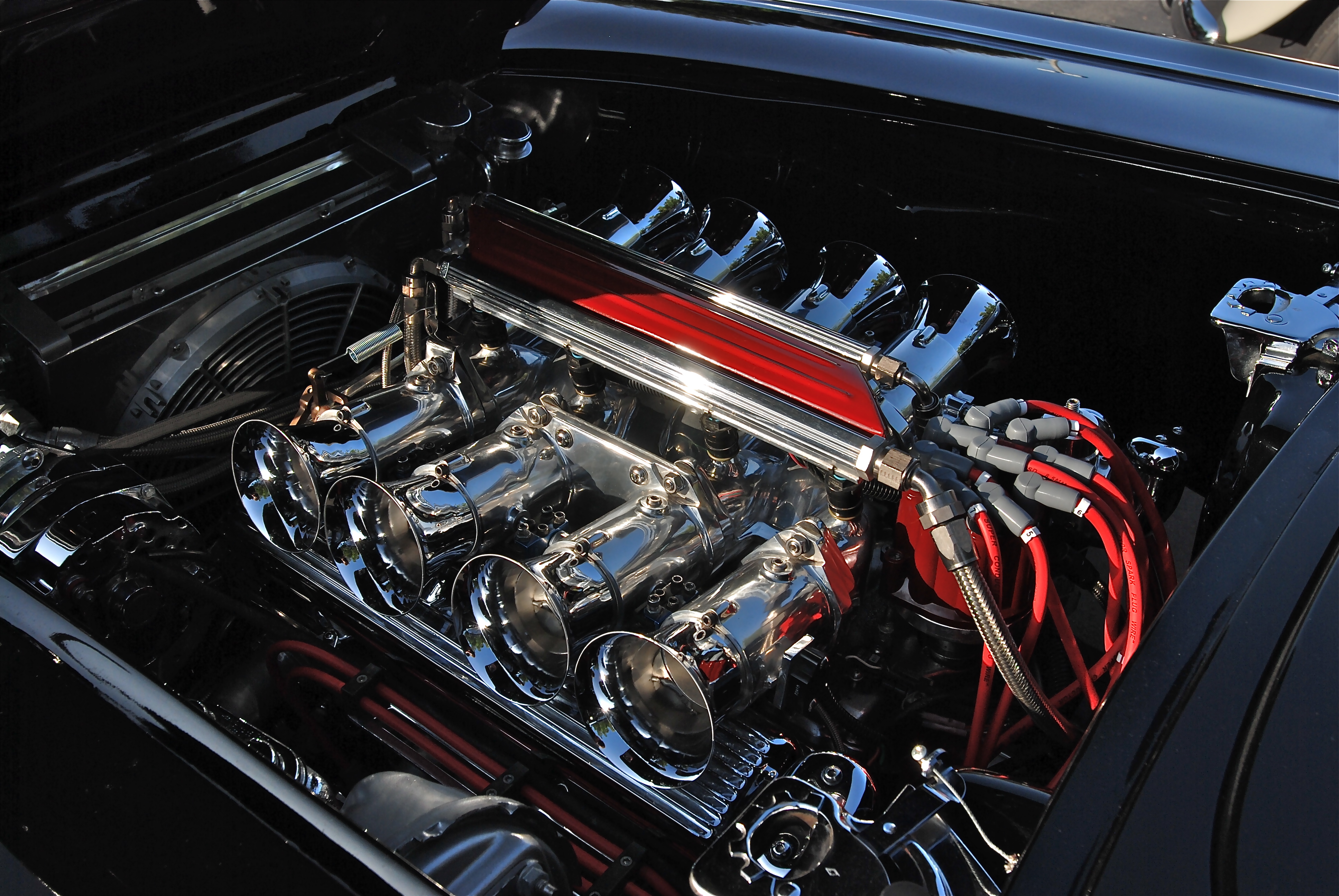 Nothing screams hot rod like highly polished chrome injectors and brightly colored accents, in this case the go fast accessories found within the engine compartment on this black 1962 Corvette (below).