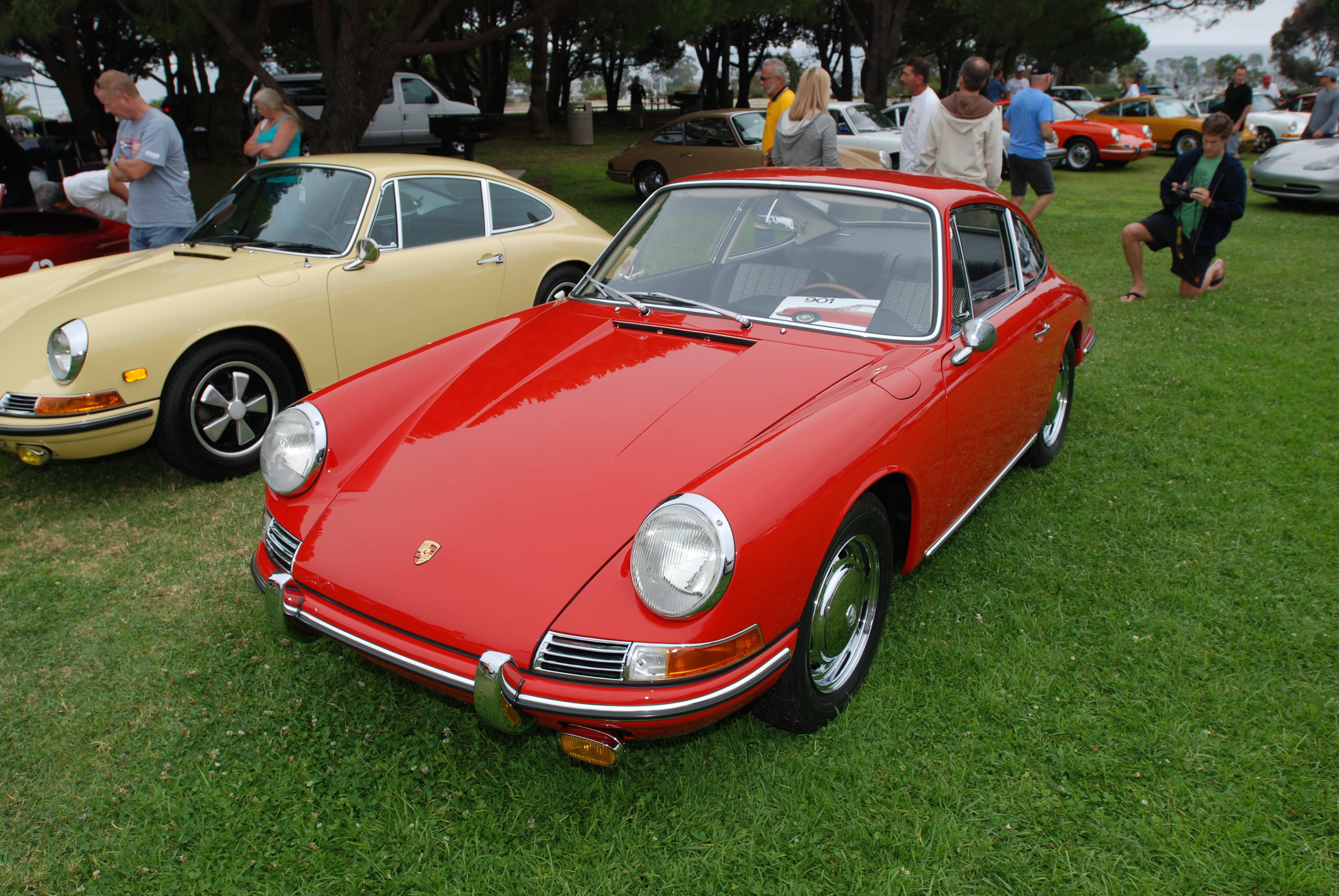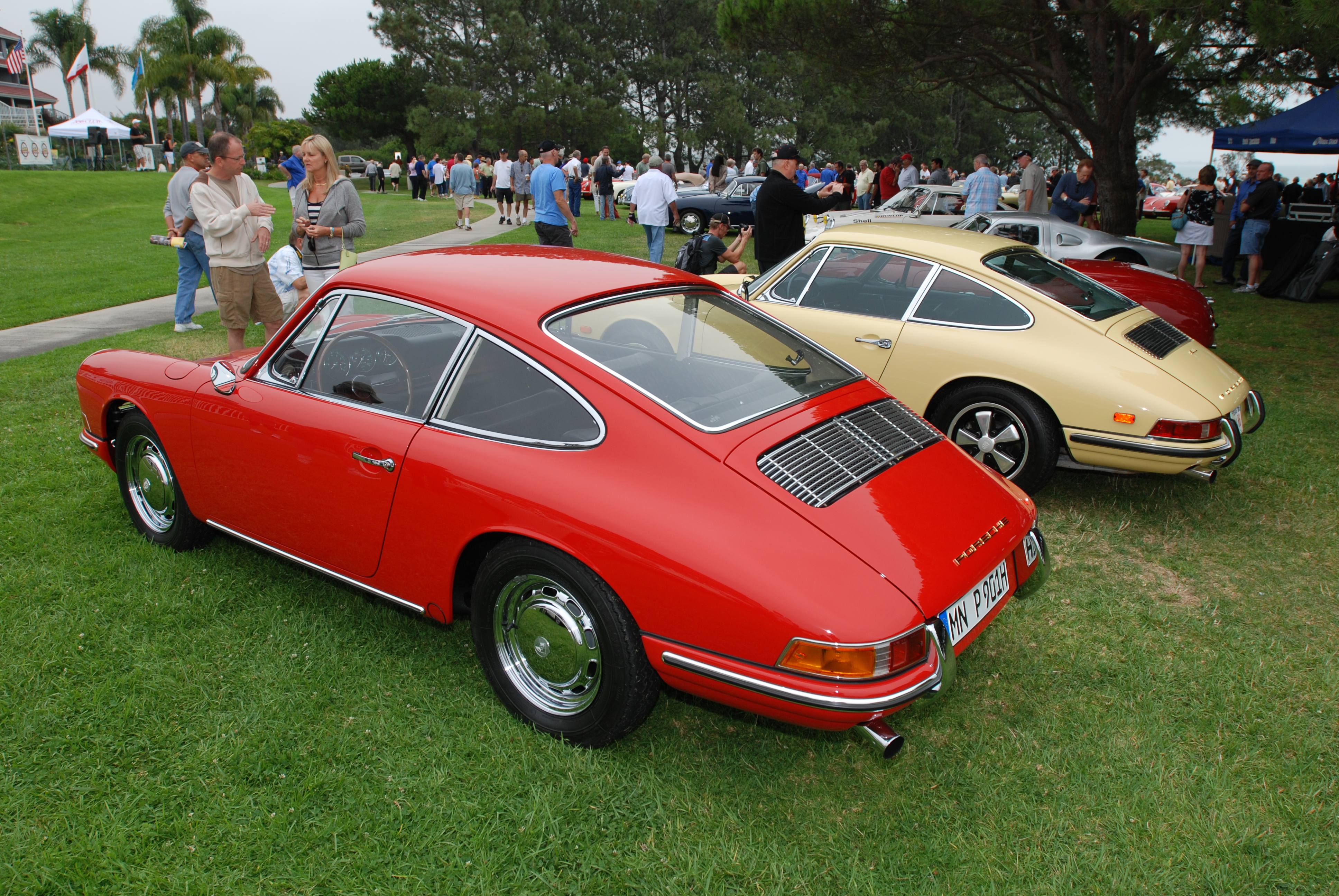 Two more beautiful and rare Porsches seen below, bridging the gap between the 911 parking and the 356 Concours area. The red model as seen below, a 1964 Porsche 901, and to its right, a 1968 911L in pale yellow.