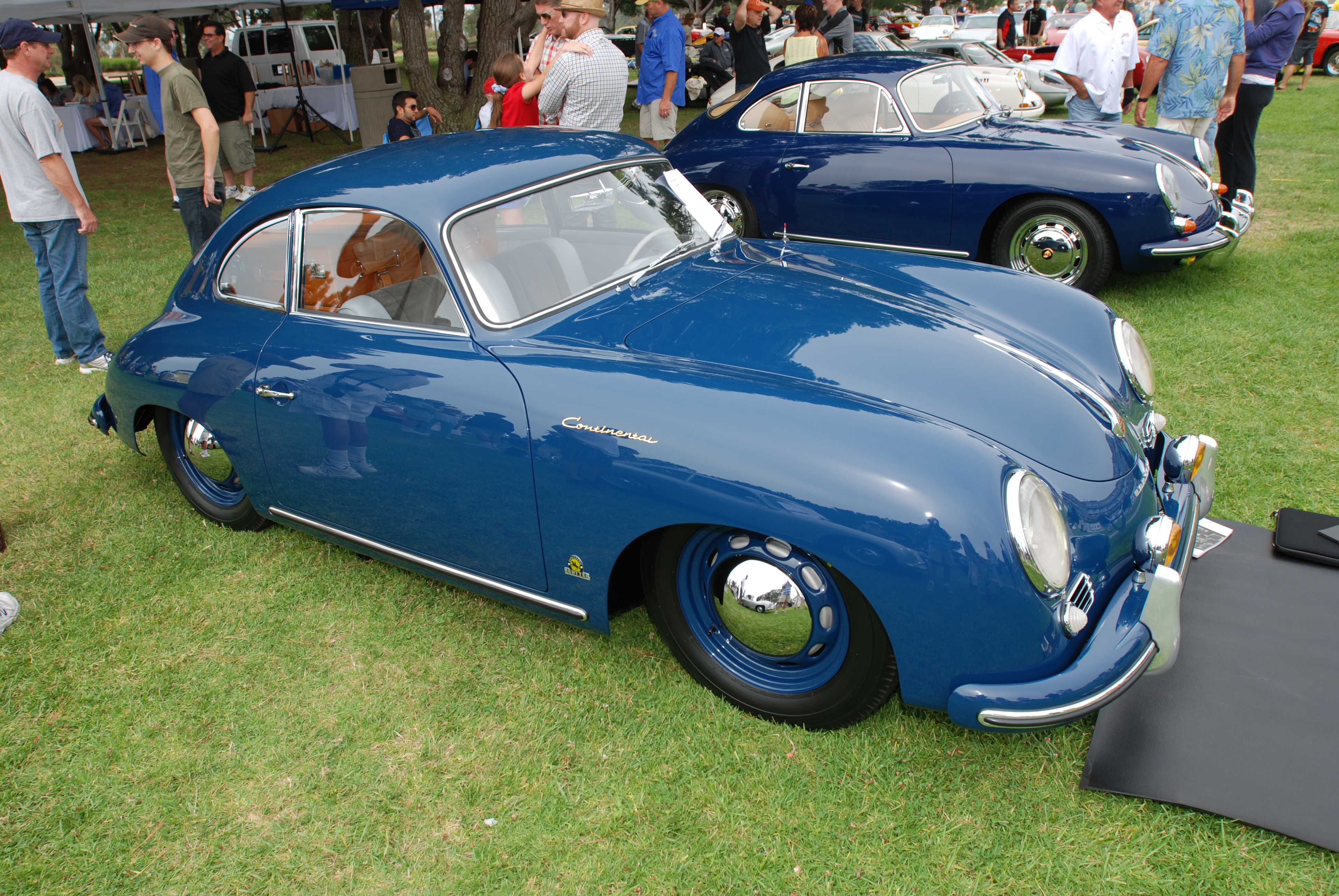 Let the judging begin. Parked several rows back, a Porsche 356 coupe undergoing scrutiny by one of the multiple, blue – shirt adorned Concours judging teams.