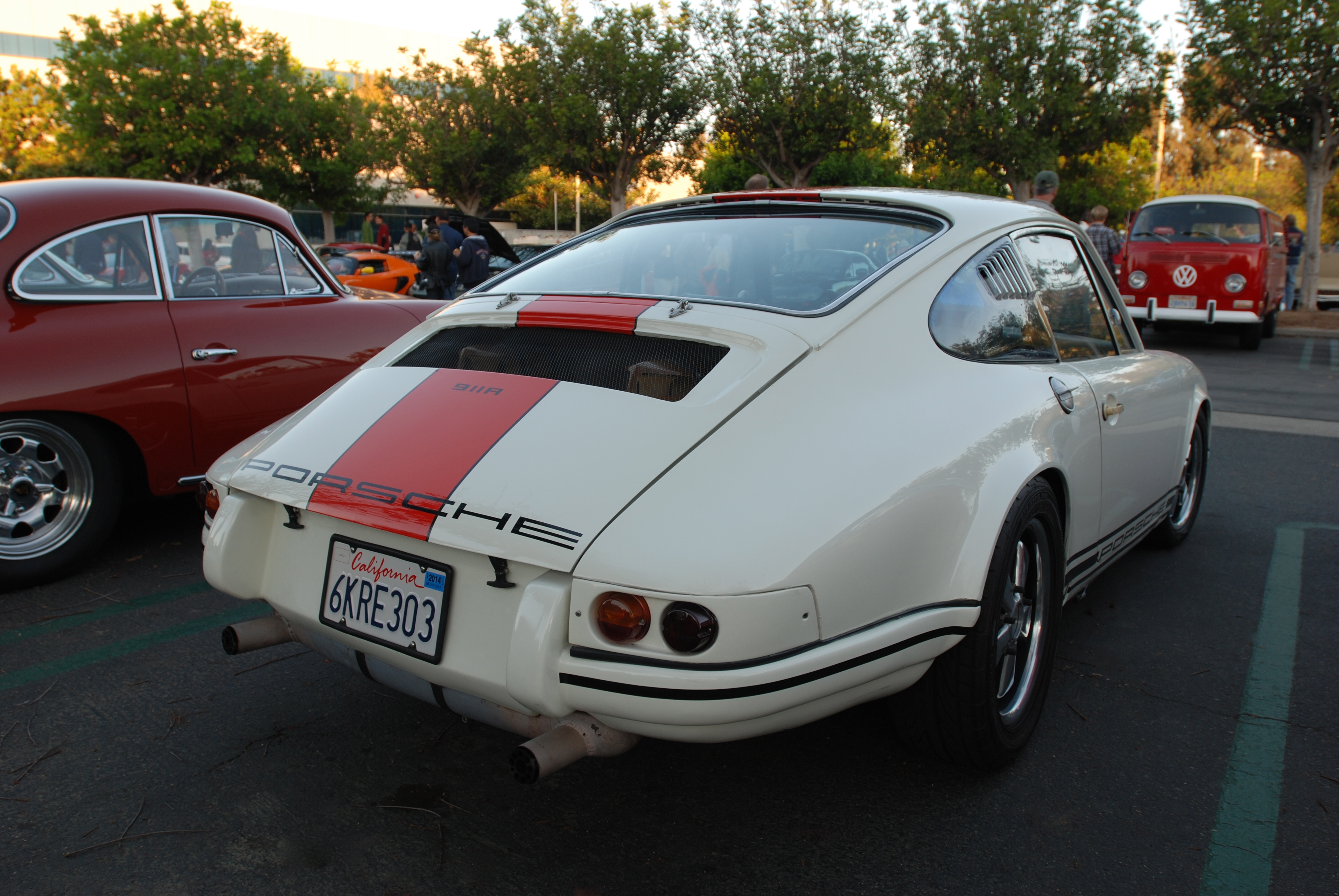 White with blood orange striped, 1967 Porsche 911R tribute_ 3/4 rear view_cars&coffee_10/19/13