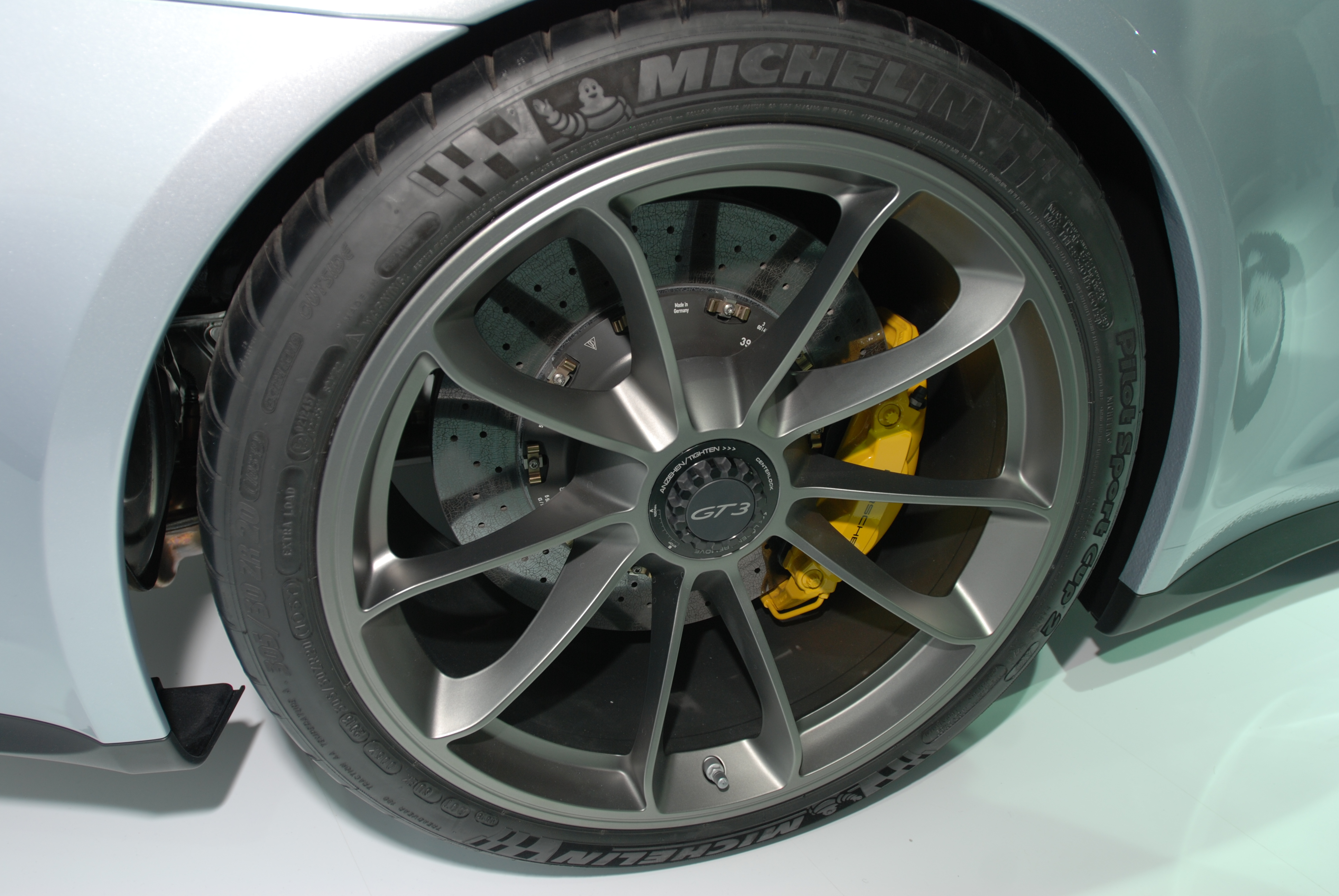 An up-close look at the GT3’s new for 2014 wheel and tire combo;12J X 20 rear forged alloy center-lock wheel, clad in the newly created 305/30ZR20 Michelin Pilot Sport Cup 2 tire (as seen below).