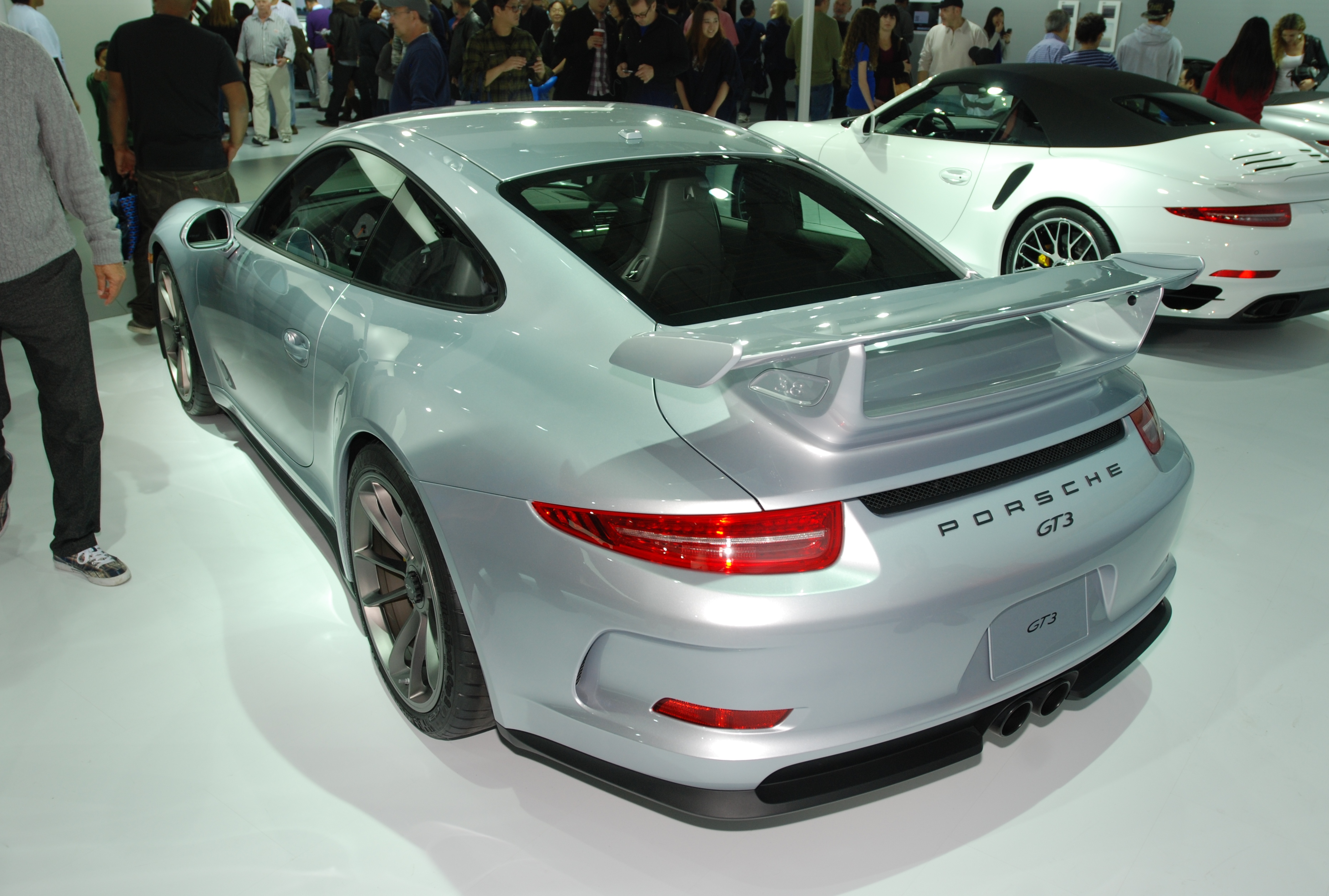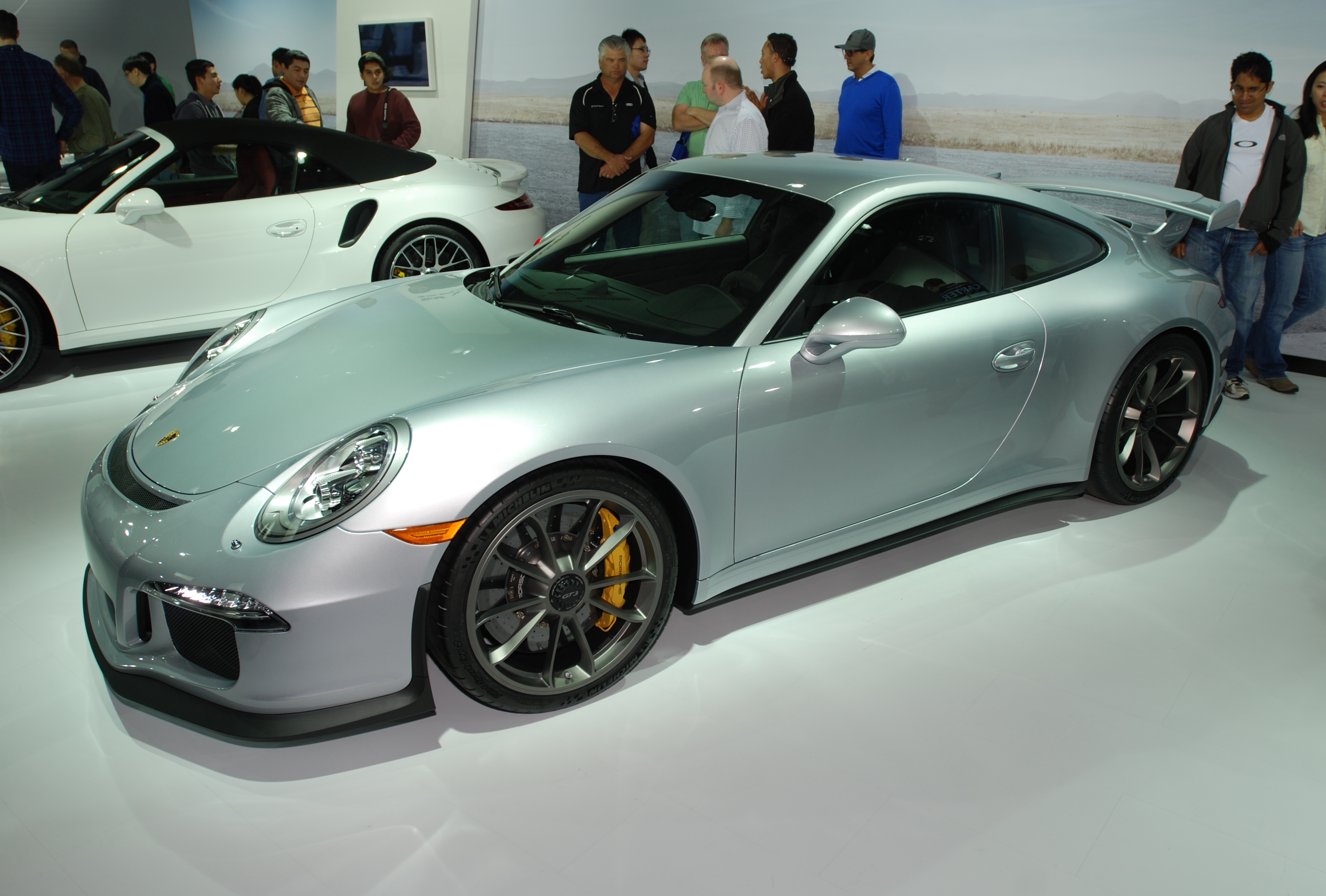 And parked to its immediate right, another model also made its world debut: a white 911 Turbo S Cabriolet, flanked by the silver, 2014 Porsche 991 GT3 coupe (as seen below).