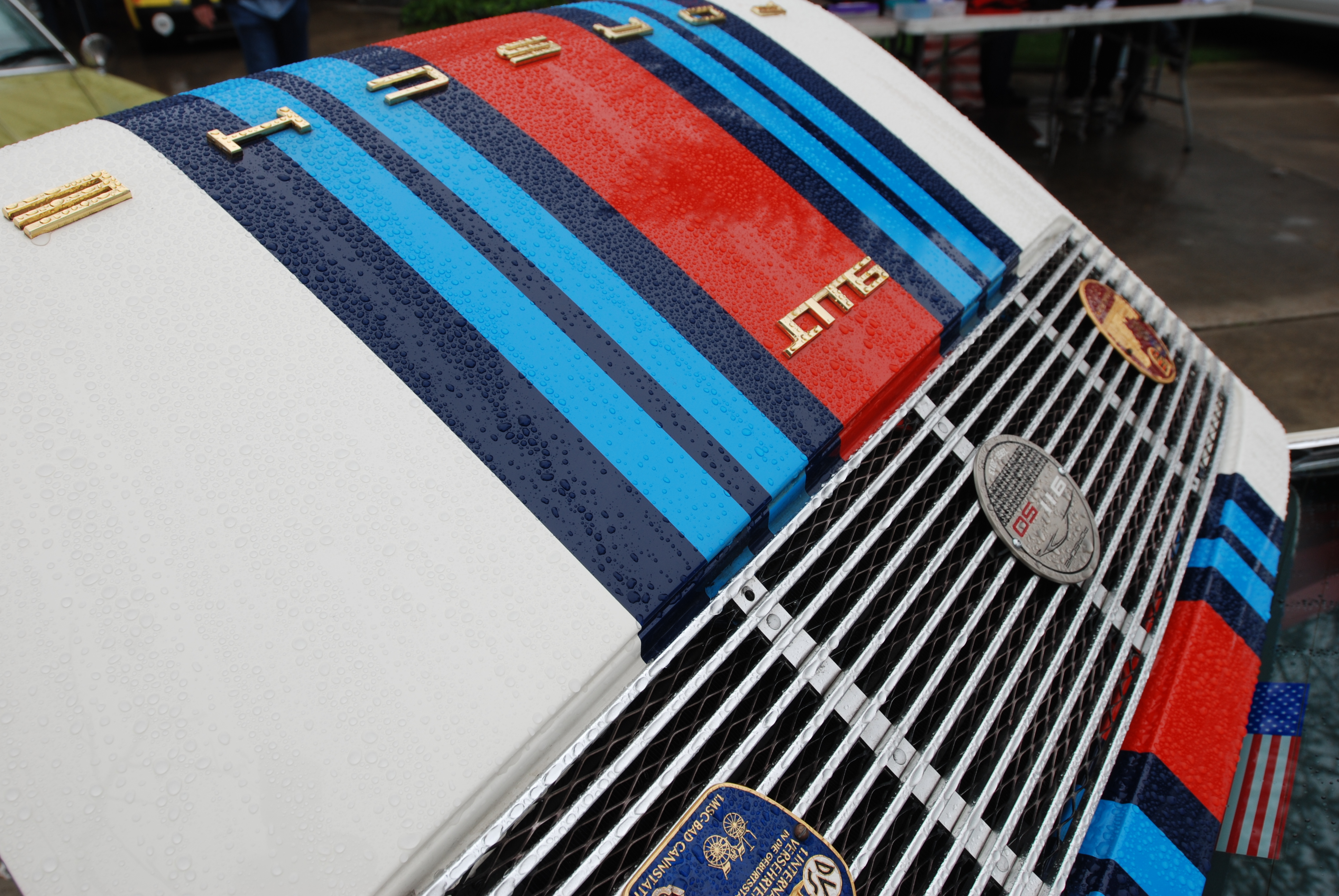 One rain-soaked rear decklid, wrapped in Martini racing graphics.