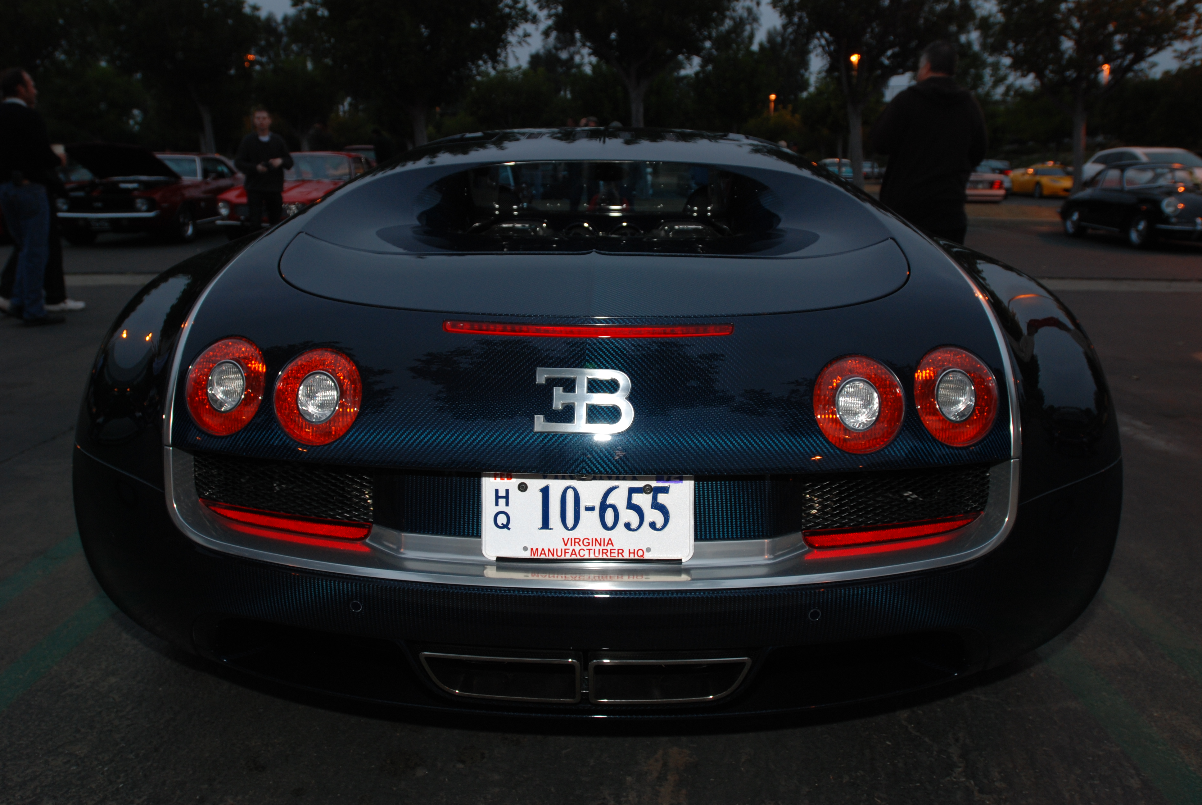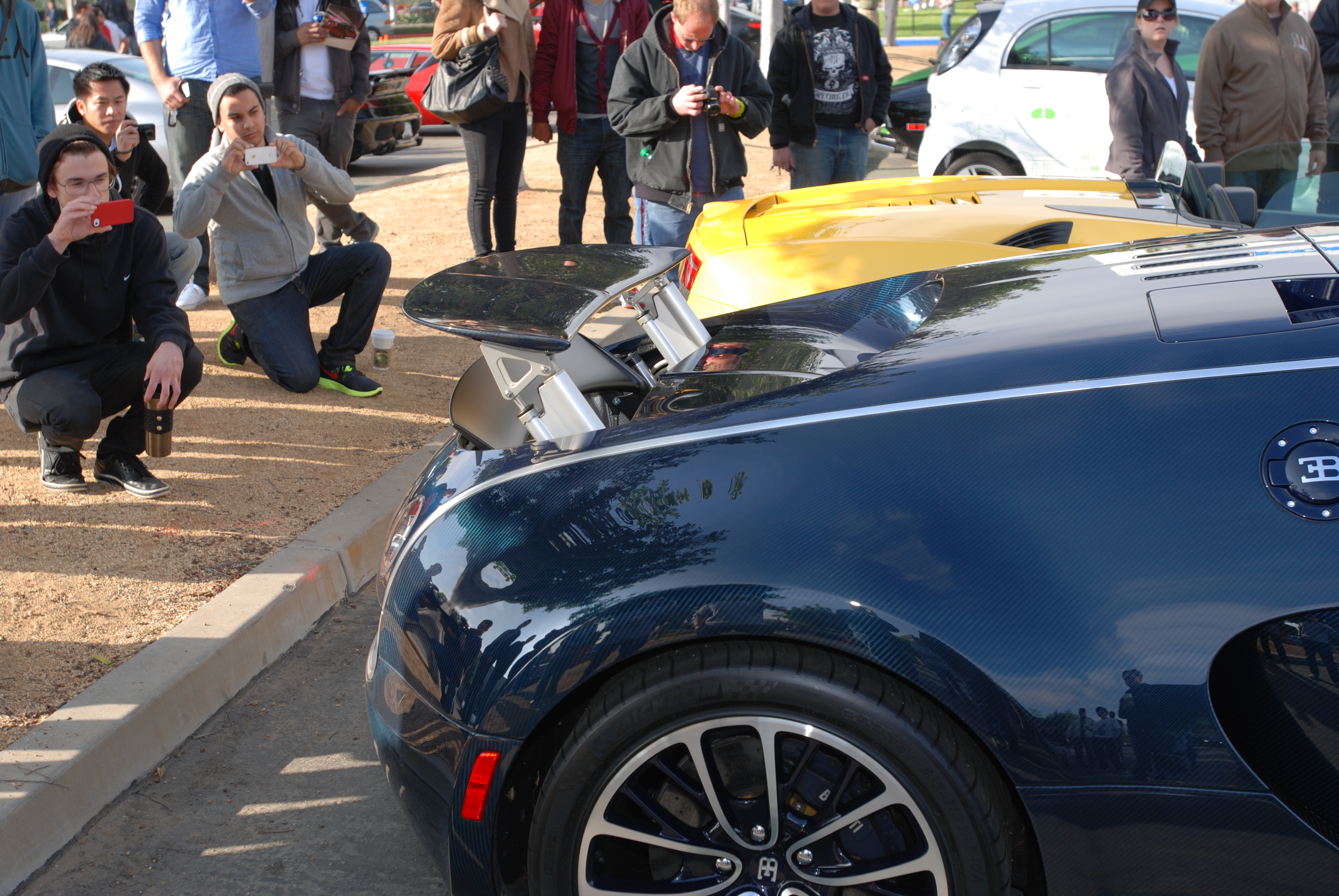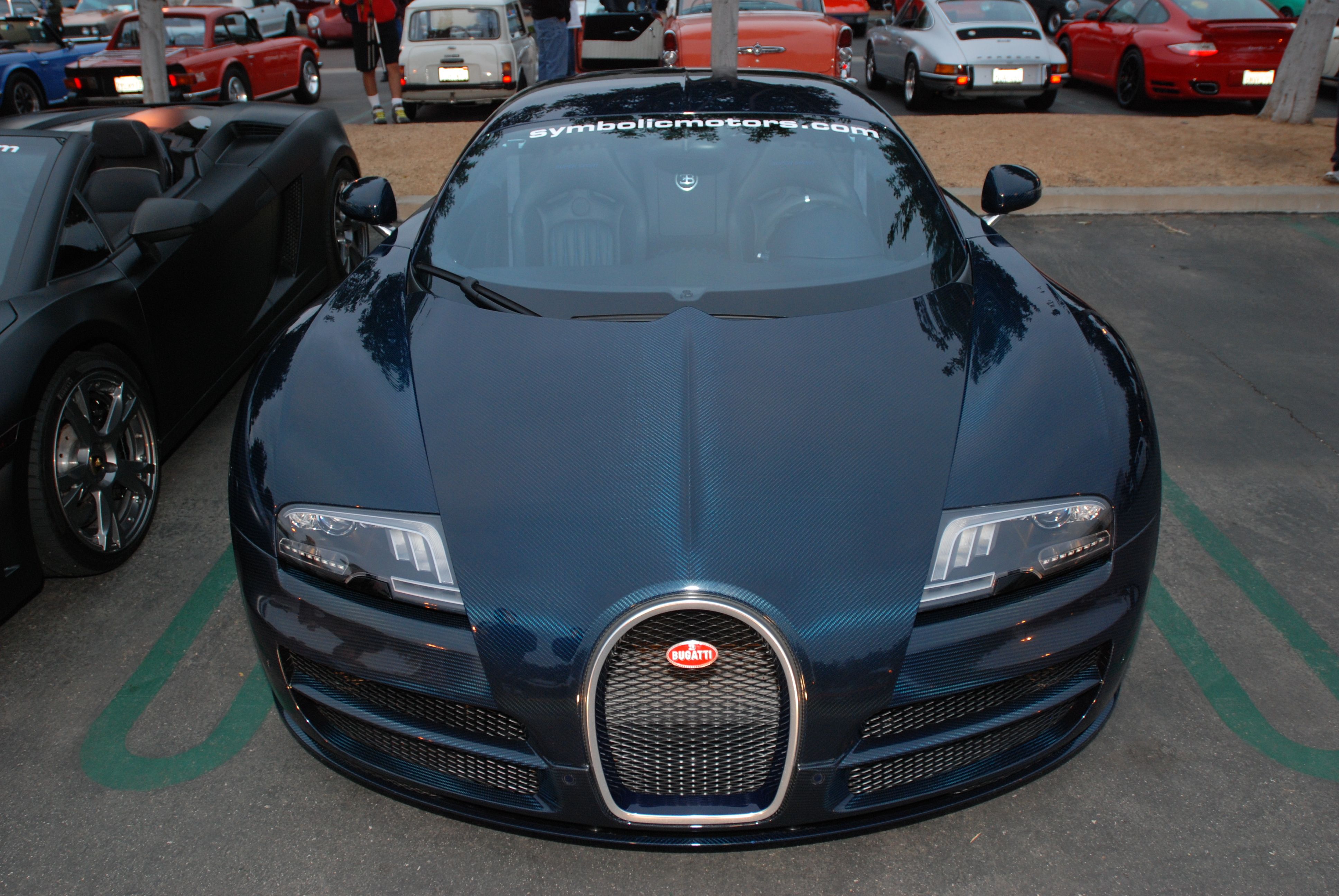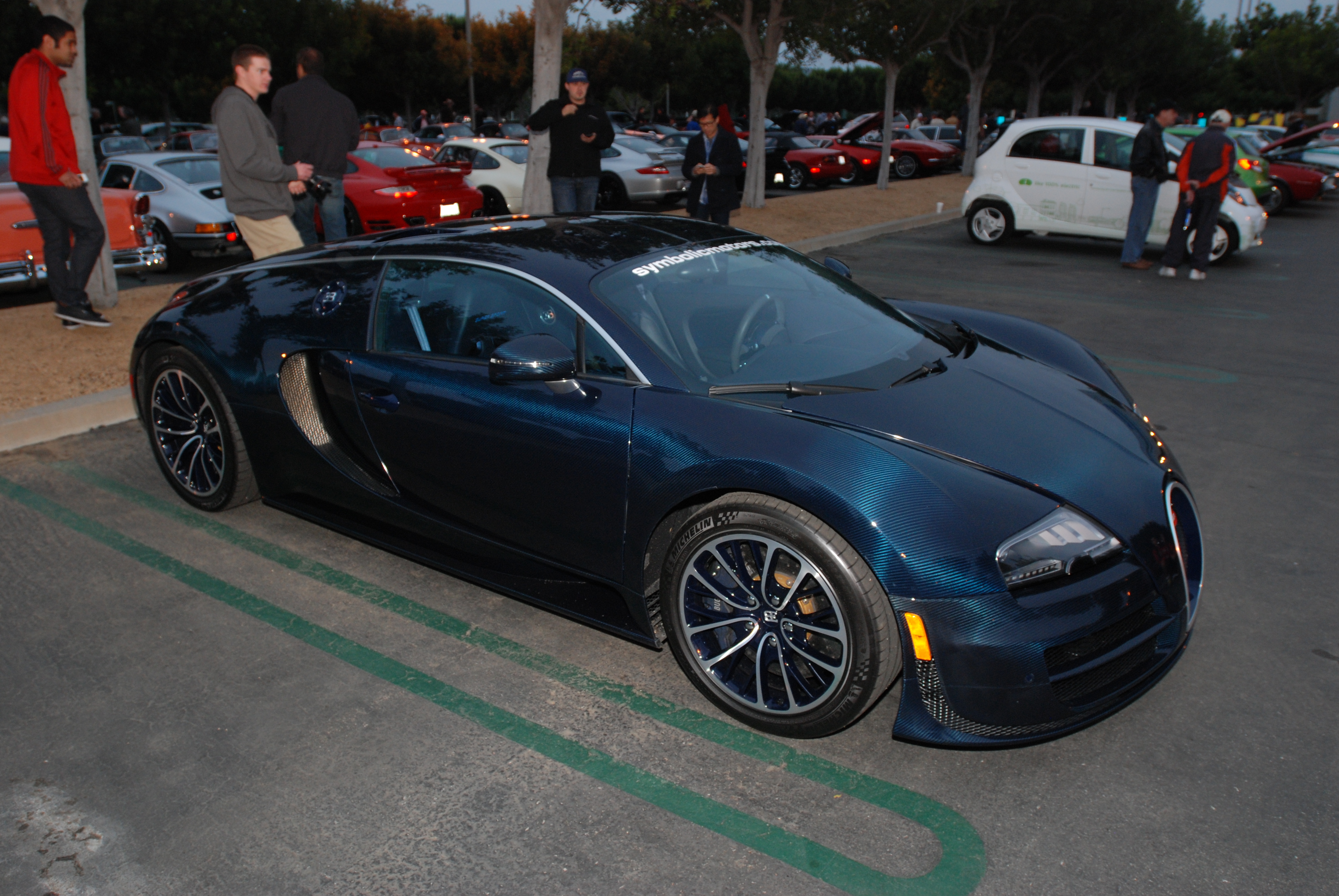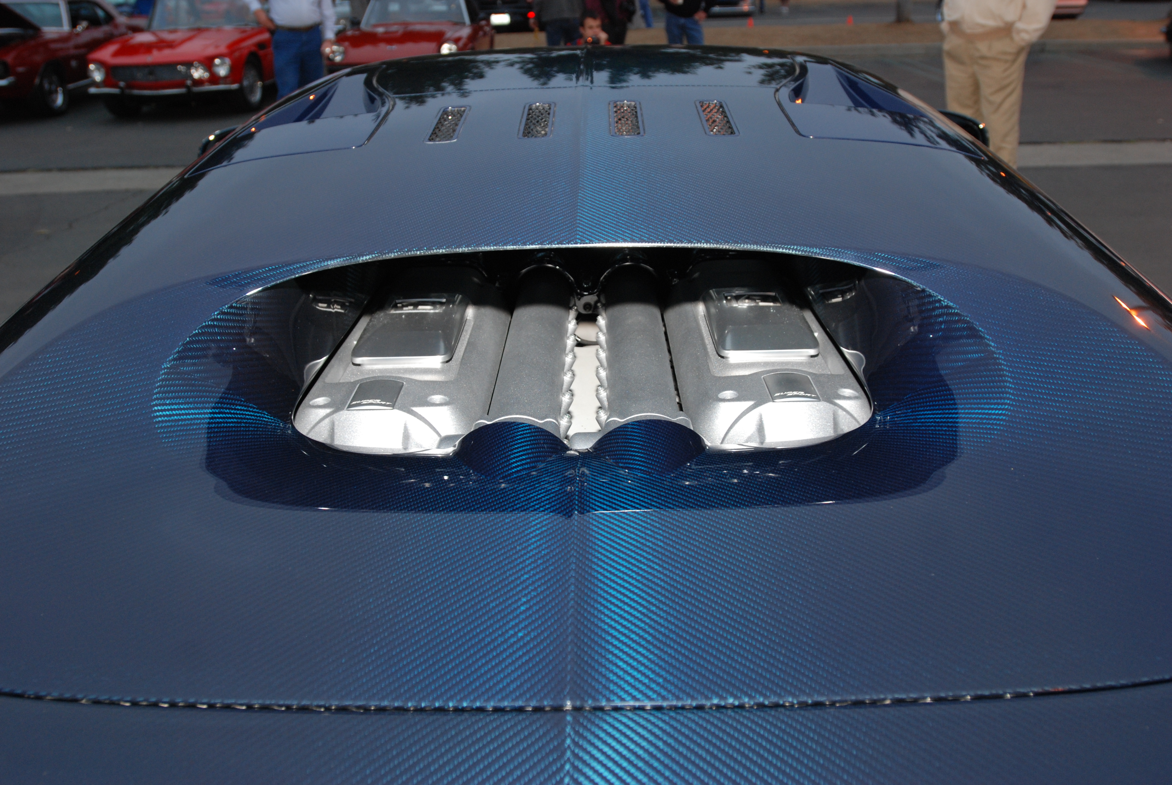 It was now time for me to check out the cars parked out on the very back rows of the parking lot, and then work my way back towards the front, row by row. Arriving on the back row, I was rewarded by the sight of two more exotics; one French and one Italian. Representing France was a fire engine red Bugatti Veyron 16.4, as seen below.