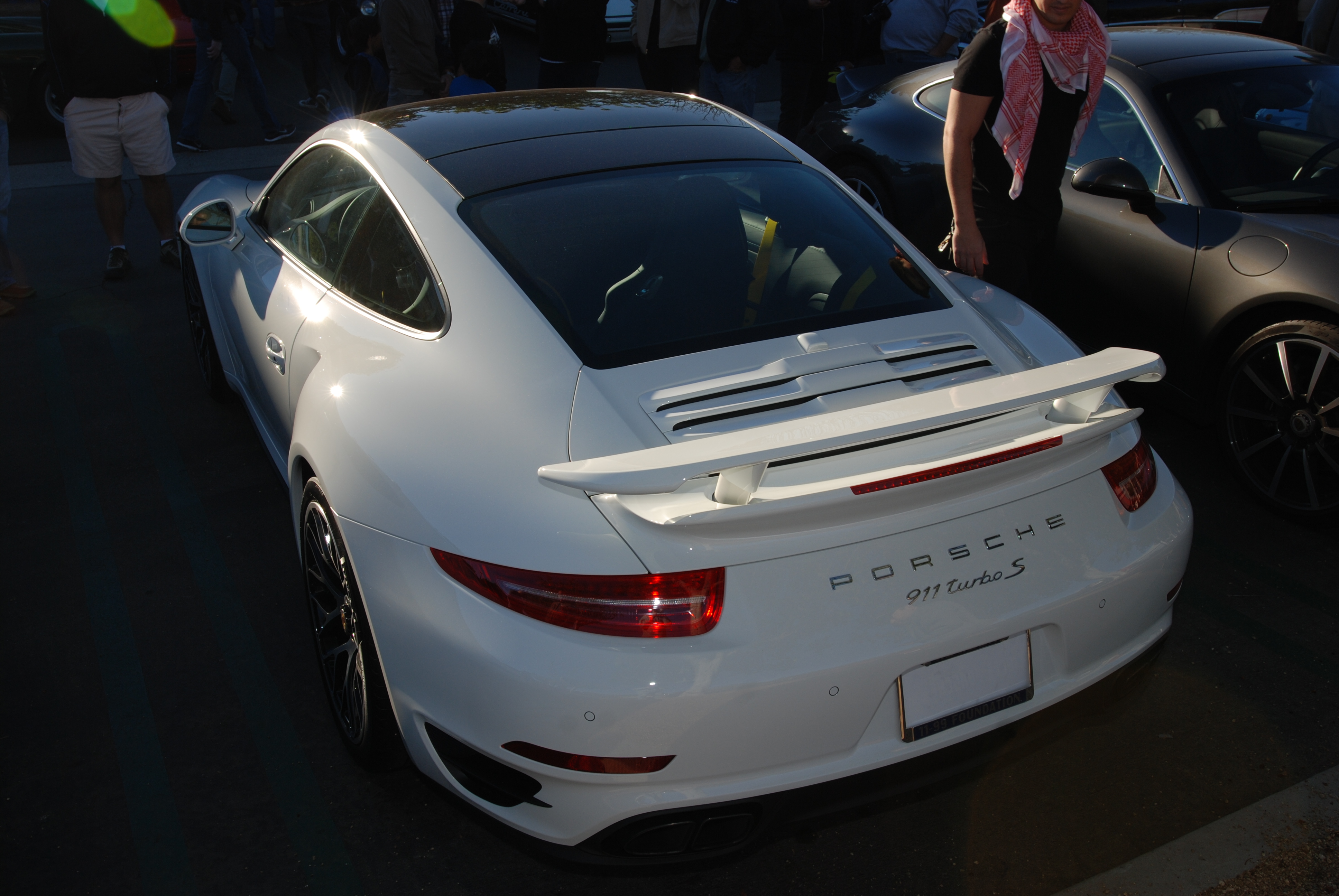 An instance of the old and the new; the silver, 1966 Porsche 912, and a brand new white, 2015 Porsche GT3.