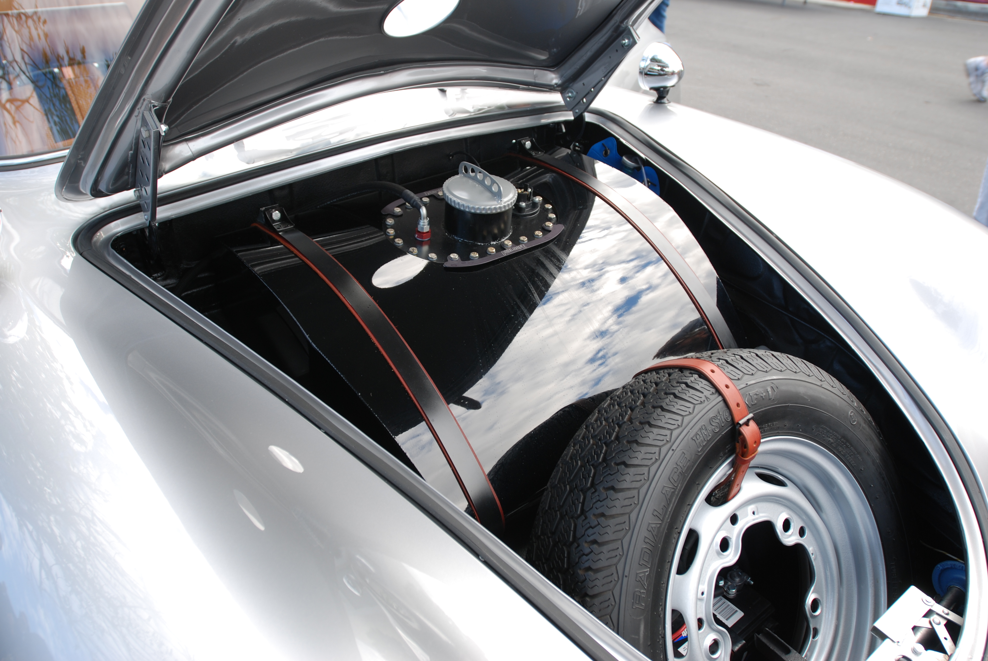 Visible through its rear window (below); the single, treaded “spare tire” and immediately to its right, the fabricated aluminum “luggage box”. A requirement mandated for all competitors in the Prototype Endurance class, per F.I.A. competition regulations that remained in effect into the 1970’s.