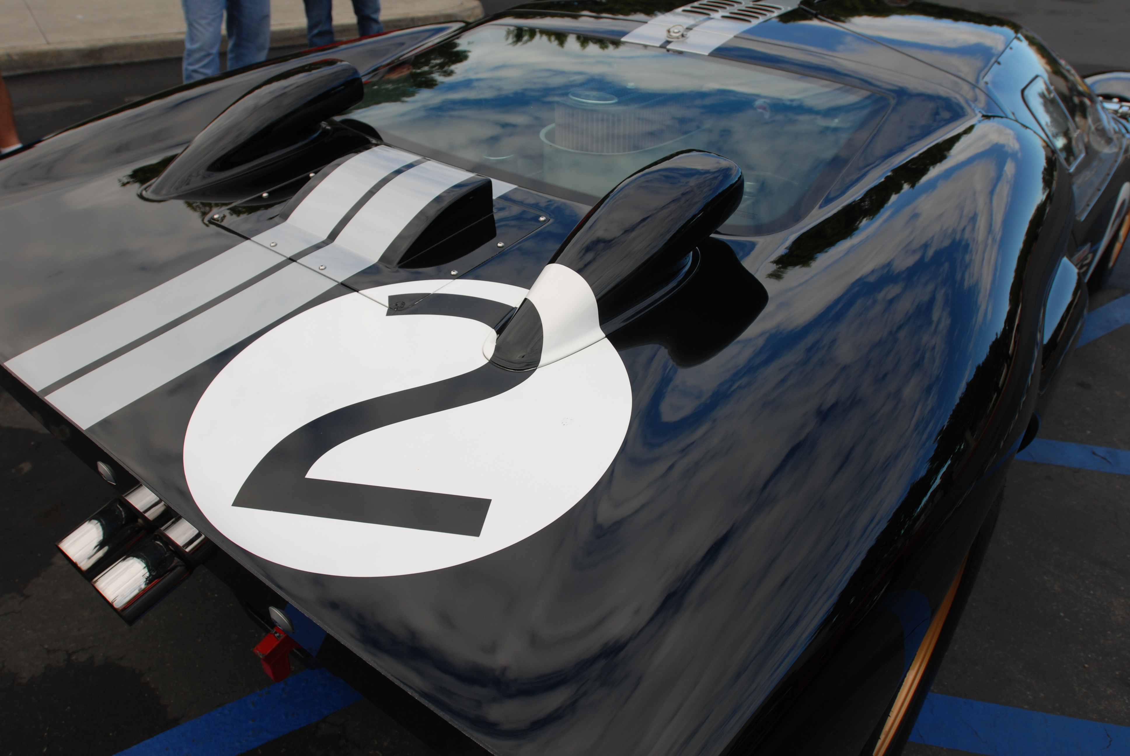 and out back, a close up view of another classic component; the premier Ford race motor of the 1960’s, the mighty 427. And as seen on this car, a motor with its dual carburetors housed within a clear polycarbonate chamber, allowing the motor to be force-fed fresh air by dual NACA air ducts, each located on the rear deck, atop the rear fenders.