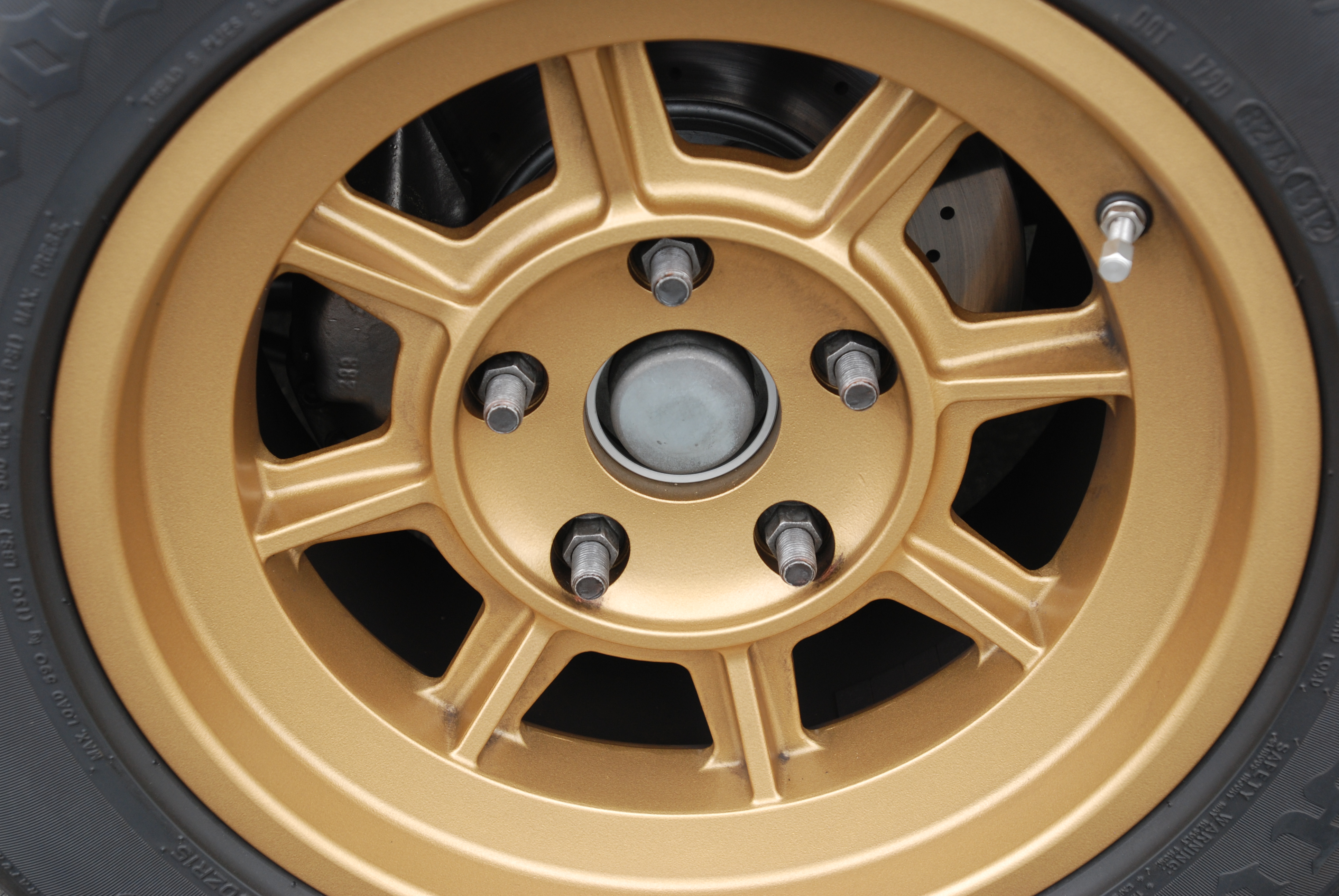 The very cool, gold satin finished Group 4 PAG 15 wheels mounted up front -15″ x 8″ rims on Hoosier tires (as seen below)…