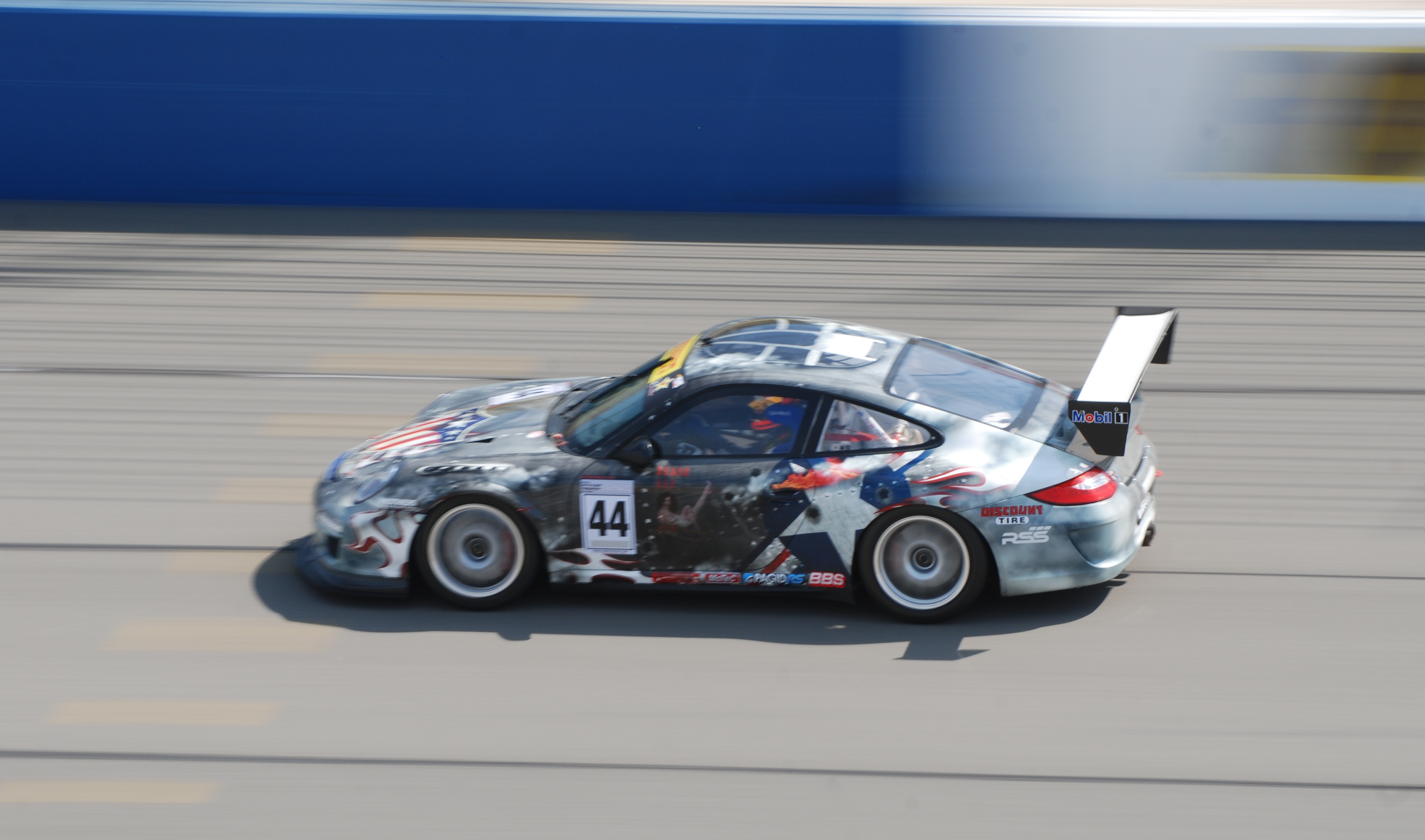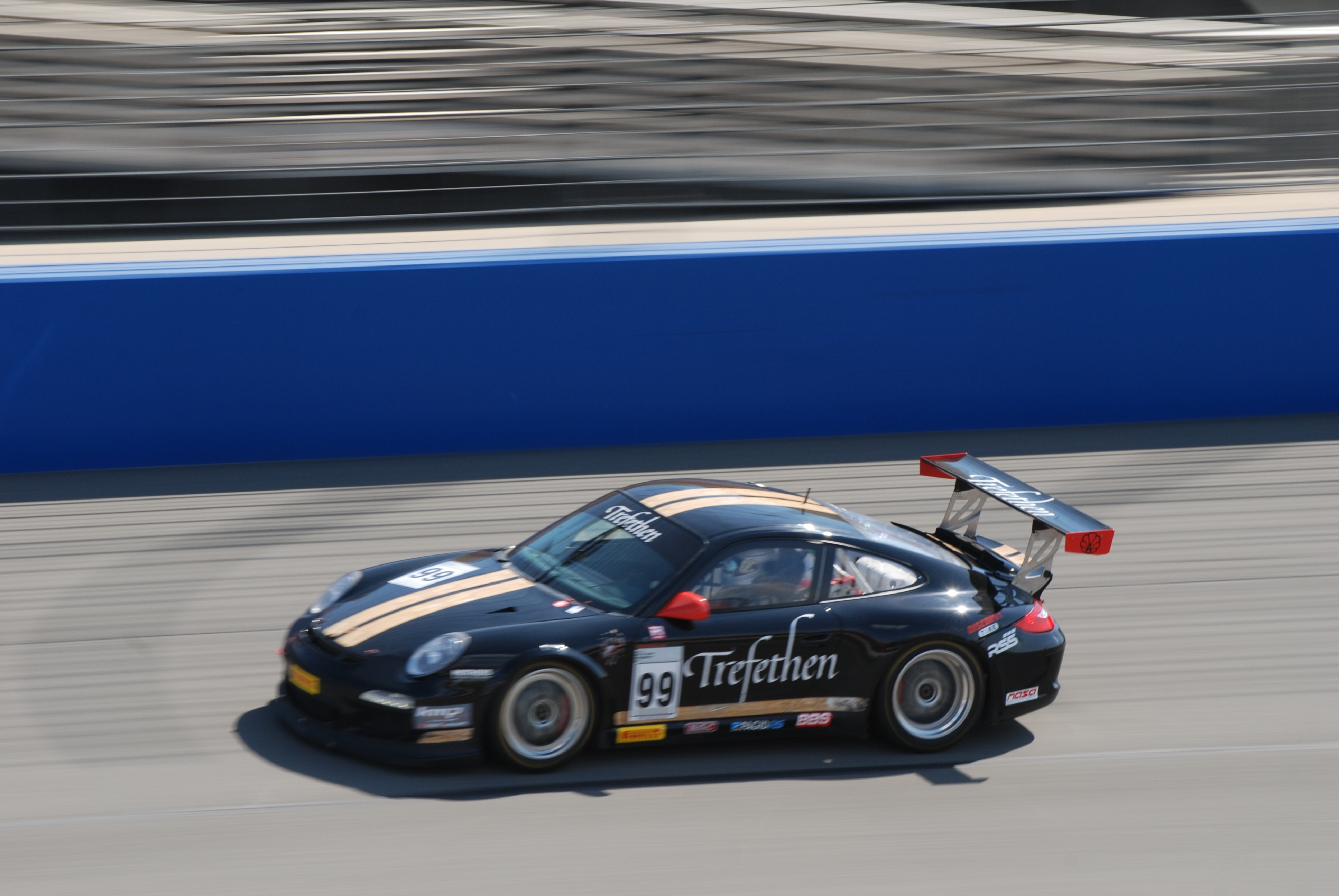 My first hour and a half of the race was spent exploring the Dunlop curve and Chicane area of the track. And by 4:30pm, the Dunlop curve location proved to be a good choice, especially when the gray clouds that had been gathering over the track, decided to rain on this automotive parade. As the skies open up, I was able to take cover beneath the projecting roofline of a cantina located on the infield side at the Dunlop curve. Here I could stay dry and continue to shoot the race from under cover for the next half hour as the storm passed. Fortunately, this was the only rain that would fall on the event.
