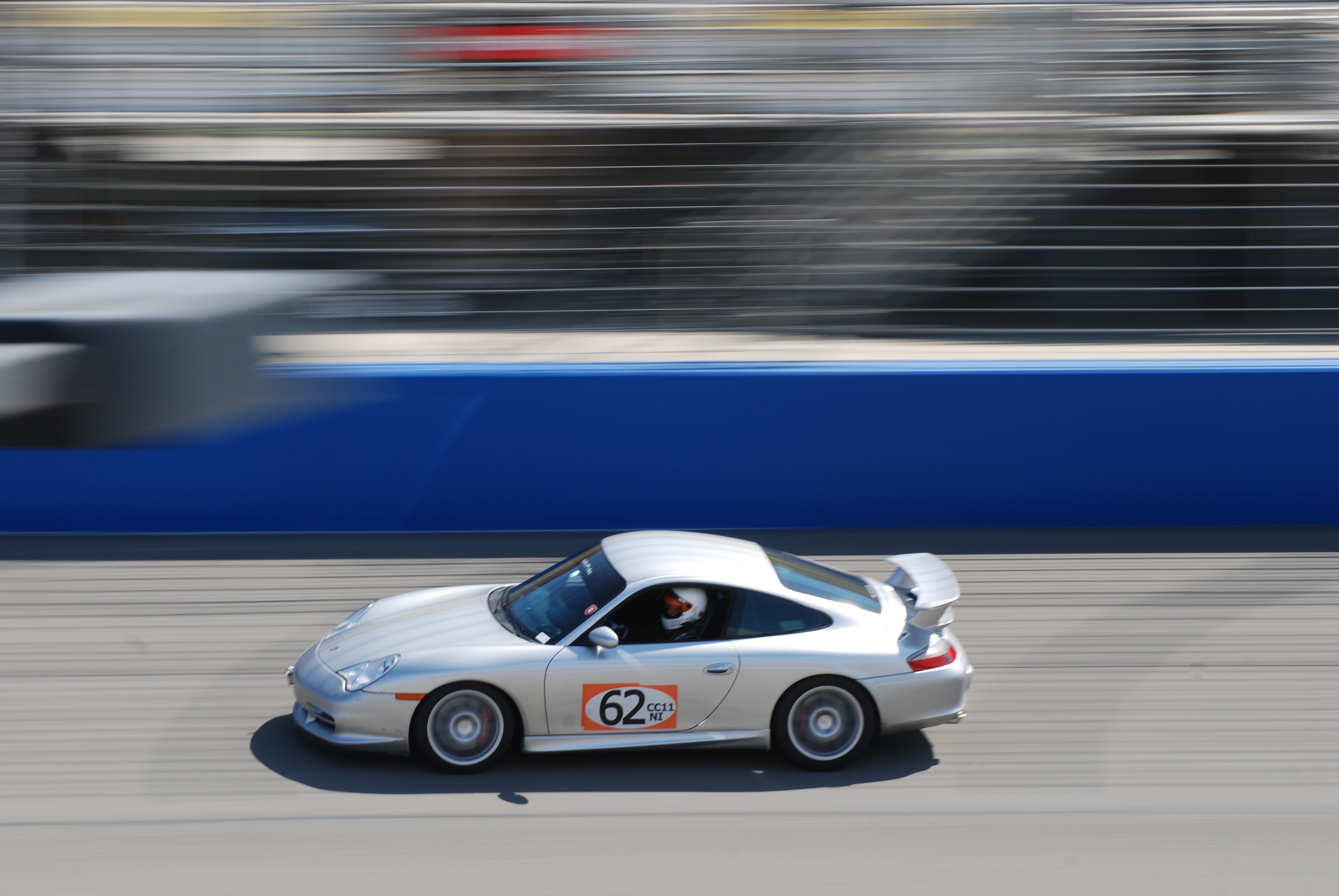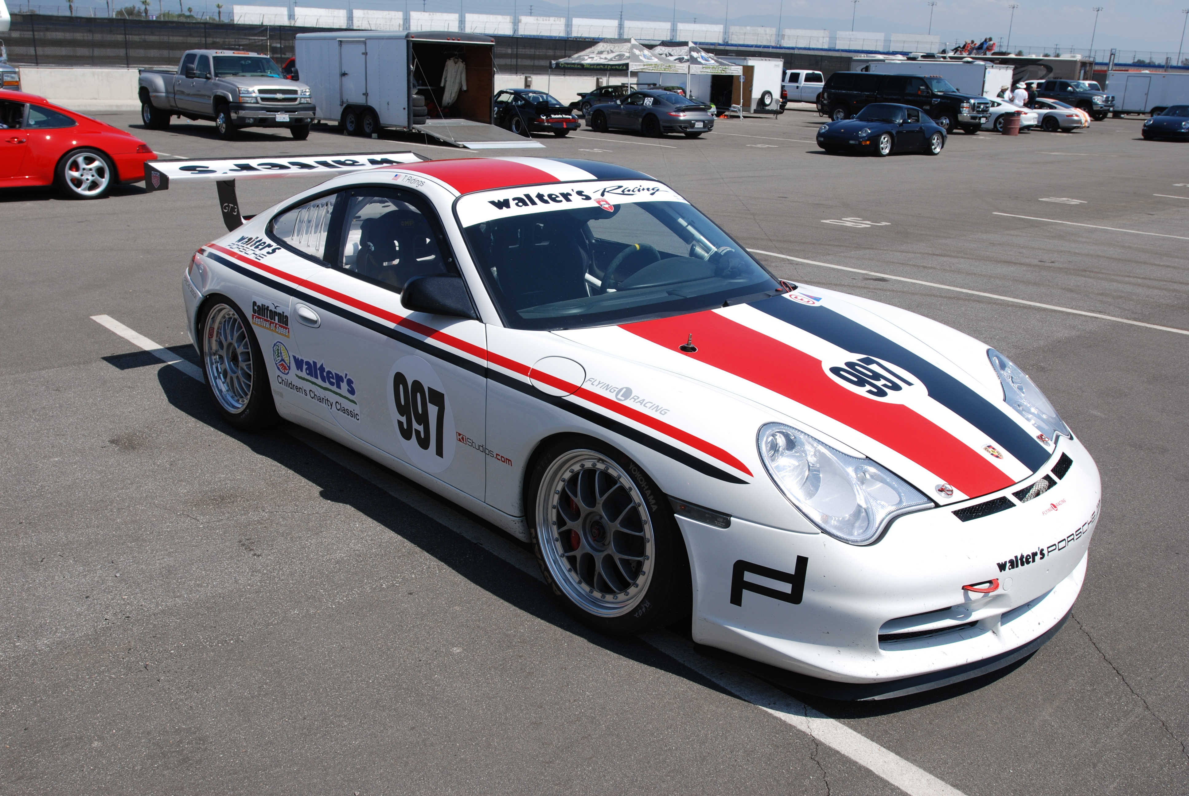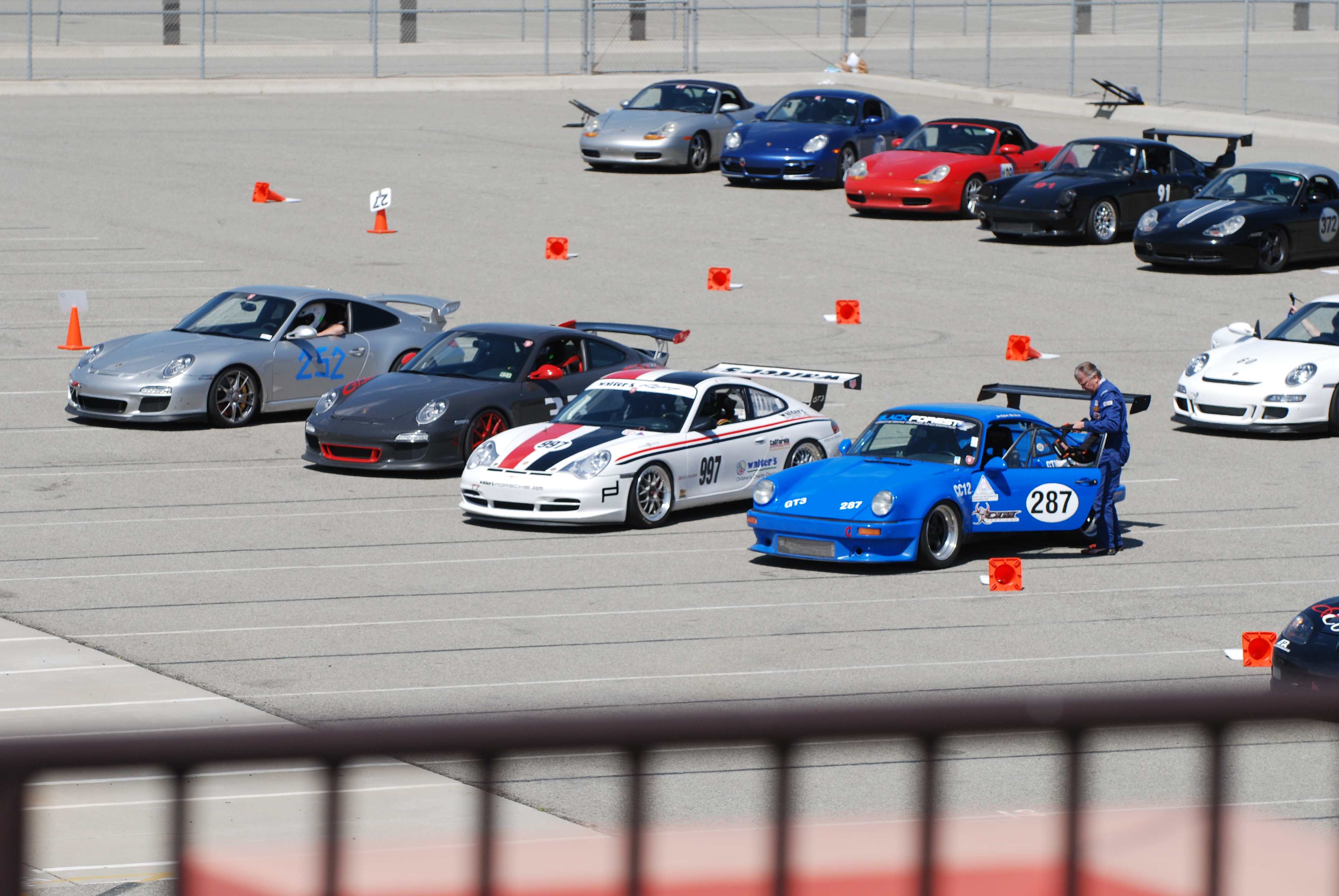 After arriving at the race track, my first stop was at the registration building. After signing the required liability waiver, I was issued a black & white checkerboard wristband (secured onto the left wrist of every participant by the registration staff), and given my parking pass. Now it was time to drive over to the infield parking area that had been designated for the weekends festivities. By now, the sun had begun to burn off the mornings haze, and was starting to bring some heat to Fontana. Exiting my car, I could hear the unmistakable sound of Porsche race cars with their distinctive exhaust notes echoing off of the grandstands, as they screamed past the start/finish line, beginning another lap.
