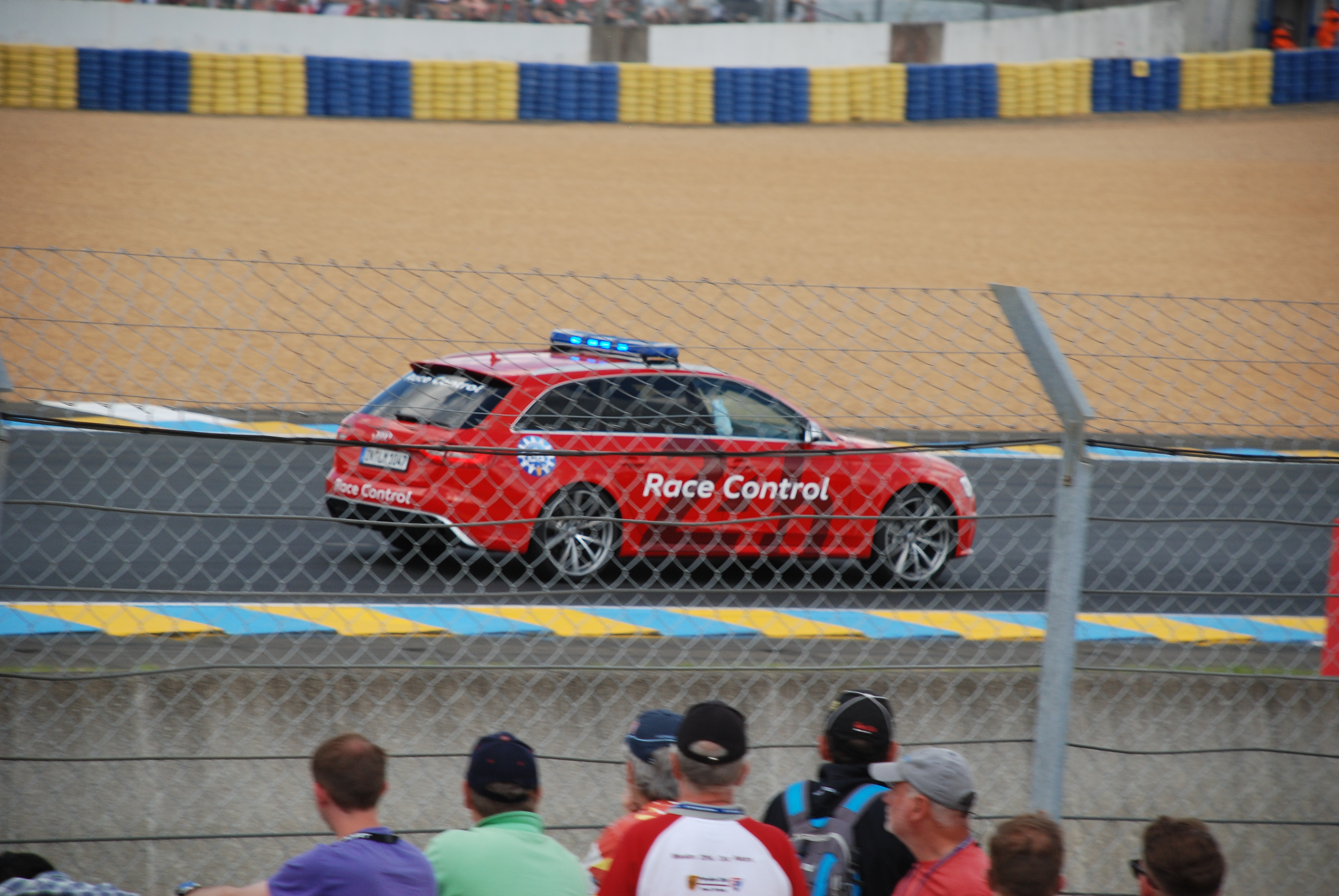 With the last of the skydiving trio successfully back on the tarmac, the final countdown to the start of the Le Mans 24 Hours race began. After another brief announcement over the PA, there arose a collective cheer that could be heard coming from the grandstands situated along pit row, and suddenly race cars appeared on the track. Leading the pack was the brilliant red Audi RS6 Avant (as seen below), representing one of the multiple Safety and Race Control Cars provided by Audi, which would pace the pack for their warm up laps. These red Audis RS6s would reappear multiple times over the next 24 hours, anytime race conditions warranted the need for a safety car on track (in the event of an accident on the circuit, or weather issues). After picking up the race leader, the Audi RS6 Avant would control the pace of the field, until race control determined all current concerns had been resolved, and it was safe for the competition to resume.