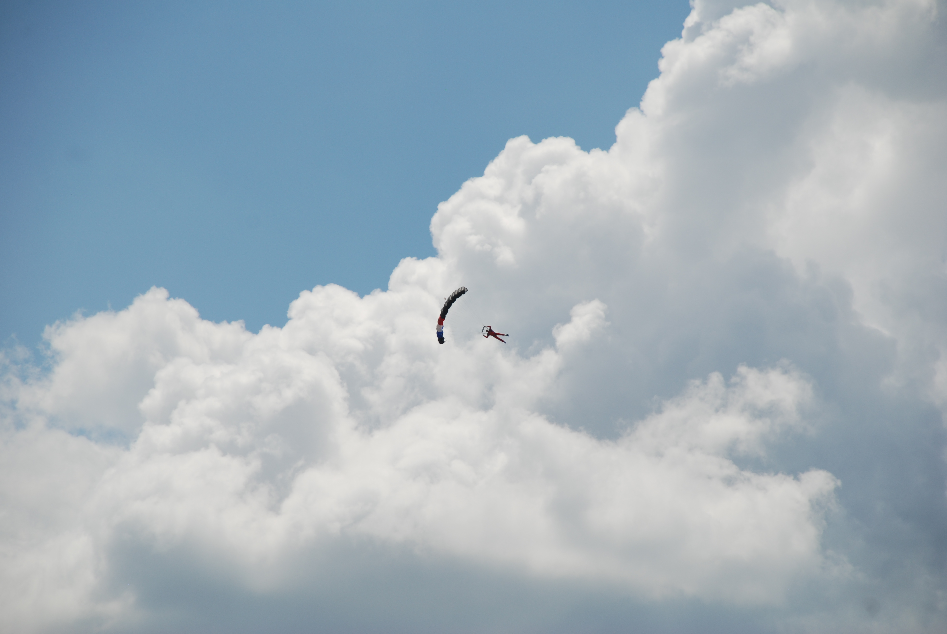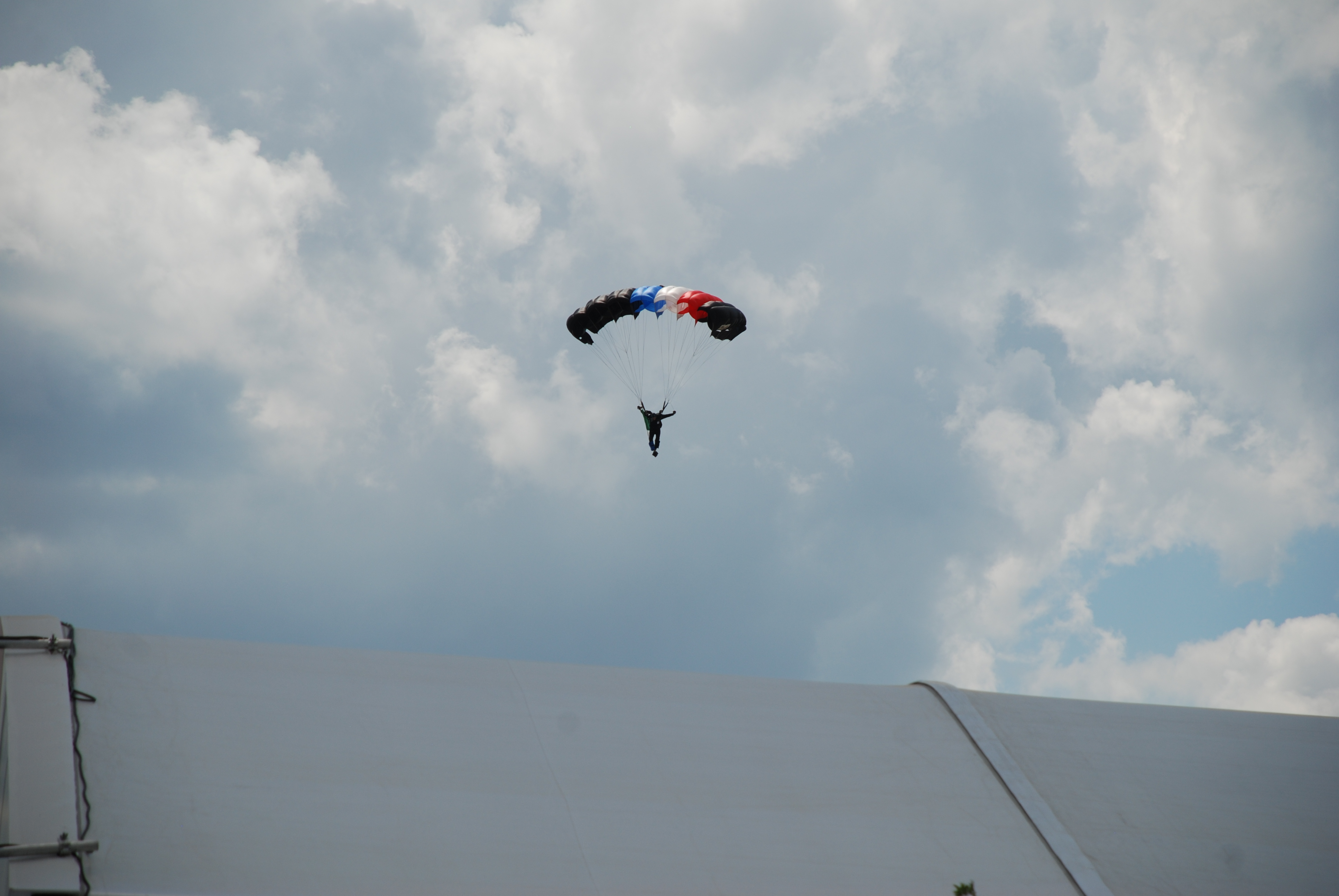 With the clock ticking and less than 1/2 hour to race time, one of the pre race activities included an aerial show. After a brief PA announcement, the event’s focus shifted skyward, just in time to catch a trio of skydivers beginning their descent.Their ultimate landing / target turned out to be the start / finish line.