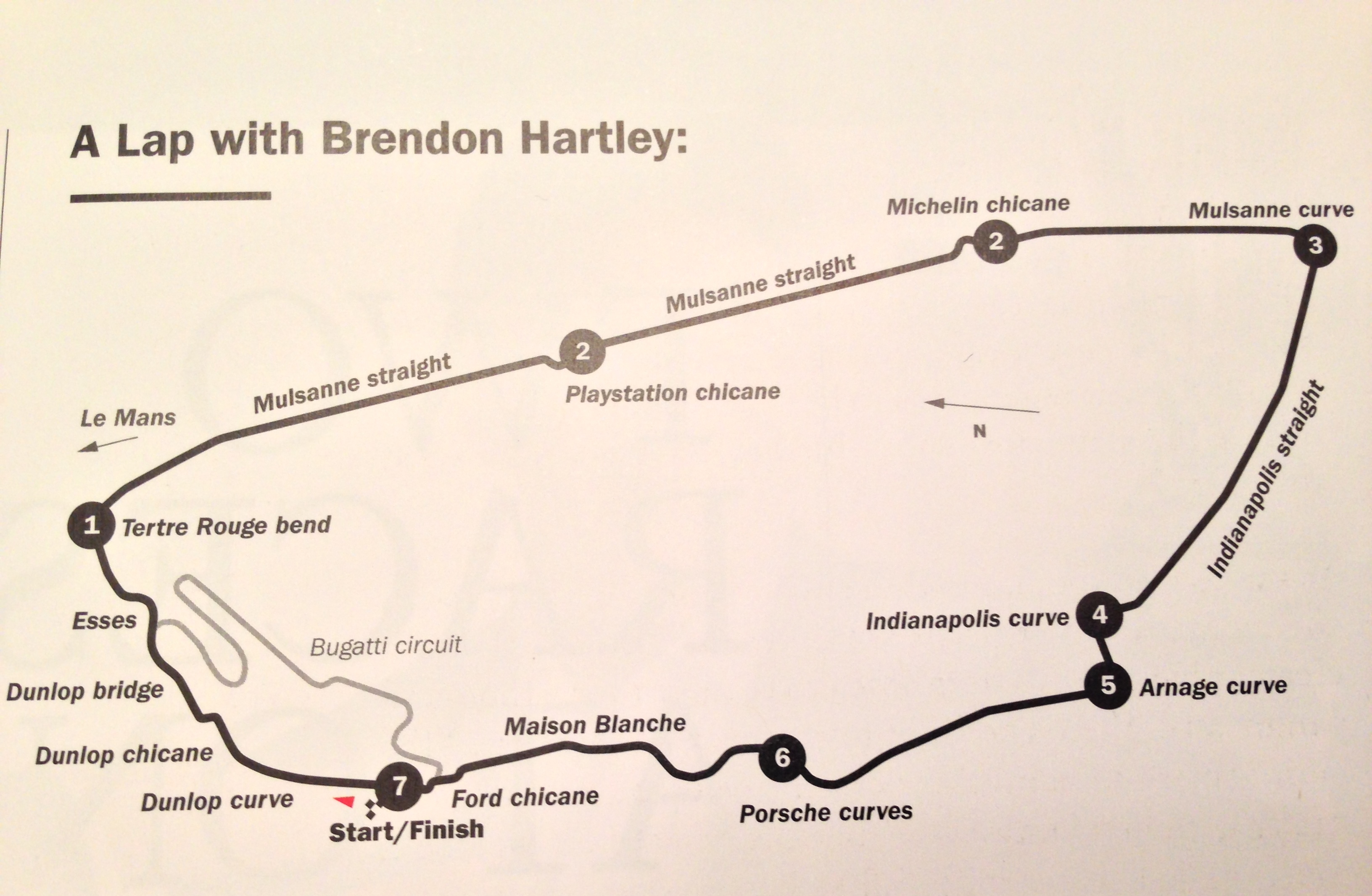 Inside, I discovered an article written about one of the newest racing drivers to join the Porsche factory team, Brendon Hartley, and his unique talents as a top simulator / virtual test driver. Brendon would be co-driving Porsches new LMP-1, 919 hybrid (car #20) with team mates Mark Webber and Timo Bernhard. Within the article was a sidebar that included a track map with key sections highlighted, and linked to a description penned by Brendon Hartley, focused on the making of an ideal lap. Seven different track sections were described, and each accompanied by his personal approach to driving the 919 at optimum speed. It was an amazing article, and his insight into racing at Le Mans made for a great read, not to mention providing me with a list of locations to explore and observe during the race.