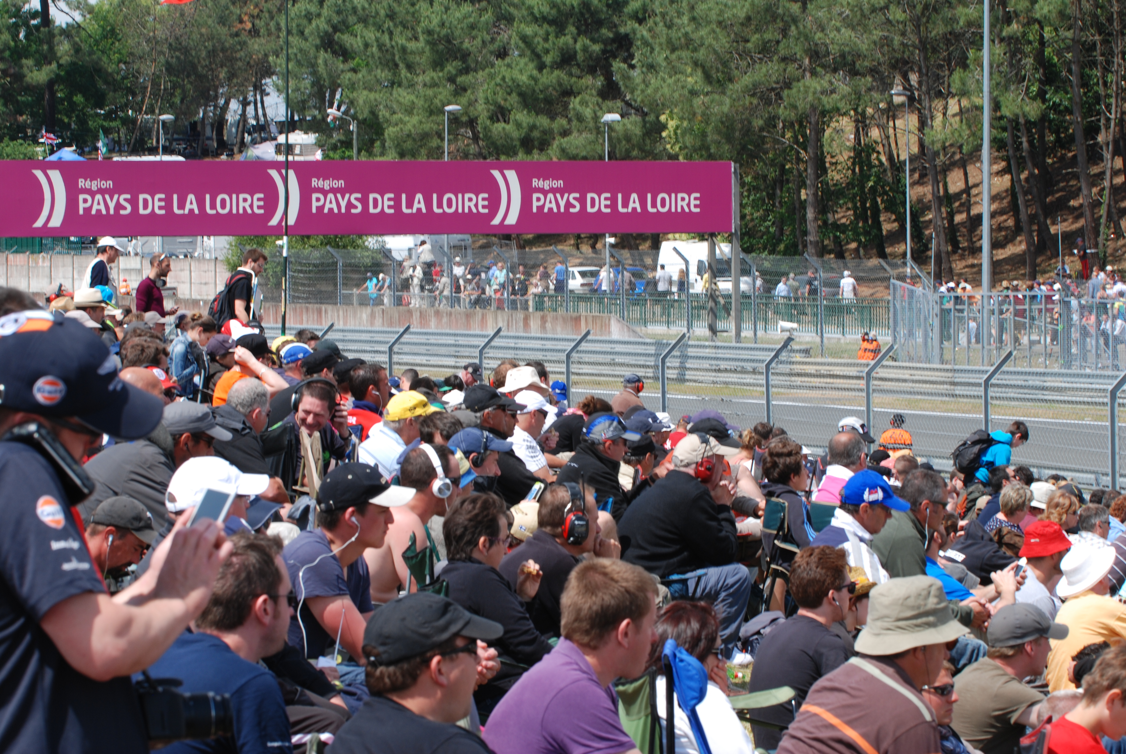 (Below), the crowd that grew around me Sunday morning, on the berm at the Tertre Rouge bend…